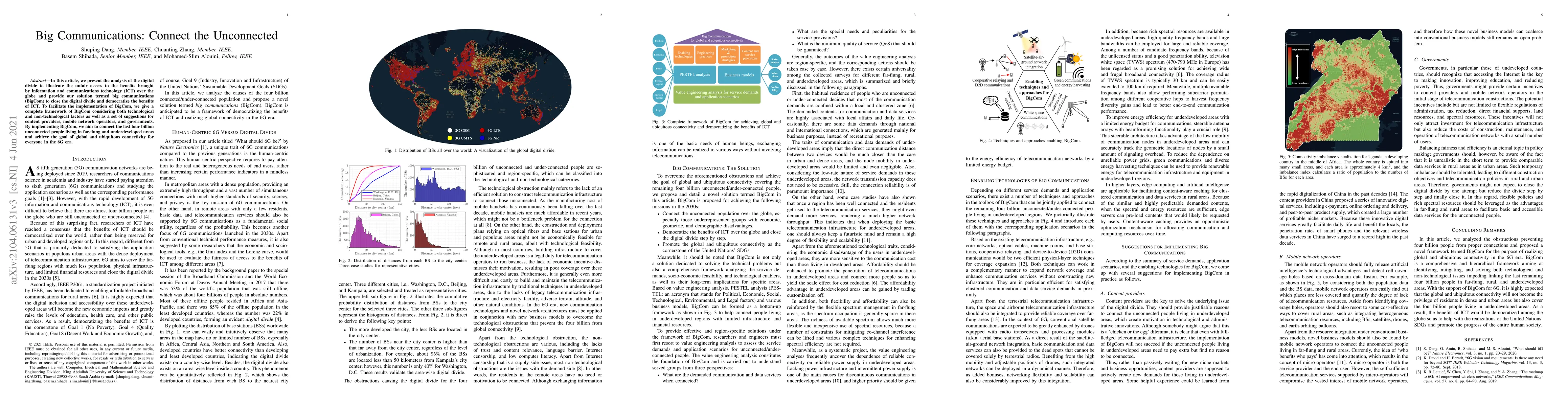 In this article, we present the analysis of the digital divide to illustrate the unfair access to the benefits brought by information and communications technology (ICT) over the globe and provide our solution termed big communications (BigCom) to close the digital divide and democratize the benefits of ICT. To facilitate the implementation of BigCom, we give a complete framework of BigCom considering both technological and non-technological factors as well as a set of suggestions for content providers, mobile network operators, and governments. By implementing BigCom, we aim to connect the last four billion unconnected people living in far-flung and underdeveloped areas and achieve the goal of global and ubiquitous connectivity for everyone in the 6G era.