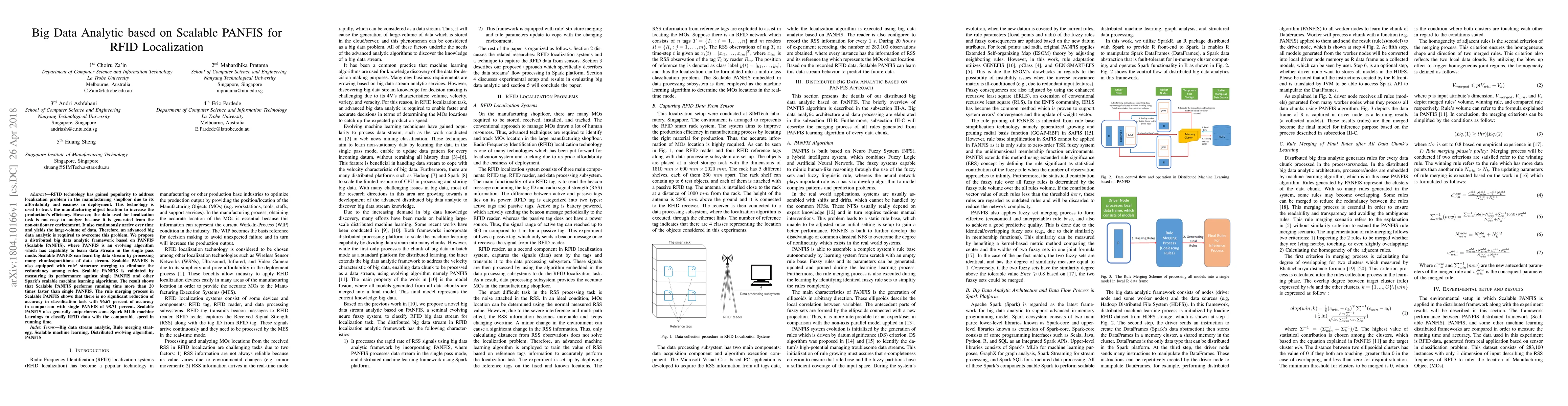 This paper proposes a distributed big data analytic framework using Scalable PANFIS for RFID localization in manufacturing. The Scalable PANFIS algorithm processes large-volume data streams efficiently and merges rules to eliminate redundancy, achieving over 20 times faster performance compared to single PANFIS while maintaining high classification accuracy.