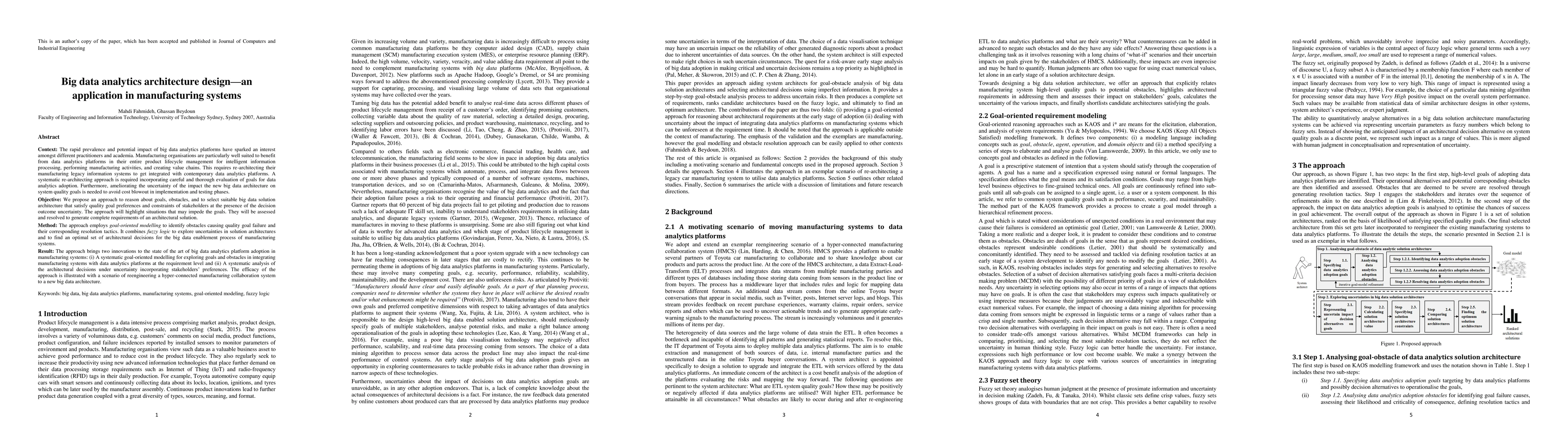 Objective. We propose an approach to reason about goals, obstacles, and to select suitable big data solution architecture that satisfy quality goal preferences and constraints of stakeholders at the presence of the decision outcome uncertainty. The approach will highlight situations that may impede the goals. They will be assessed and resolved to generate complete requirements of an architectural solution. Method. The approach employs goal-oriented modelling to identify obstacles causing quality goal failure and their corresponding resolution tactics. It combines fuzzy logic to explore uncertainties in solution architectures and to find an optimal set of architectural decisions for the big data enablement process of manufacturing systems. Result. The approach brings two innovations to the state of the art of big data analytics platform adoption in manufacturing systems. Firstly, A systematic goal-oriented modelling for exploring goals and obstacles in integrating manufacturing systems with data analytics platforms at the requirement level and, secondly, A systematic analysis of the architectural decisions under uncertainty incorporating the preferences of stakeholders. The efficacy of the approach is illustrated with a scenario of reengineering a hyper-connected manufacturing collaboration system to a new big data architecture. Keywords. big data, big data analytics platforms, manufacturing systems, goal-oriented modeling, fuzzy logic