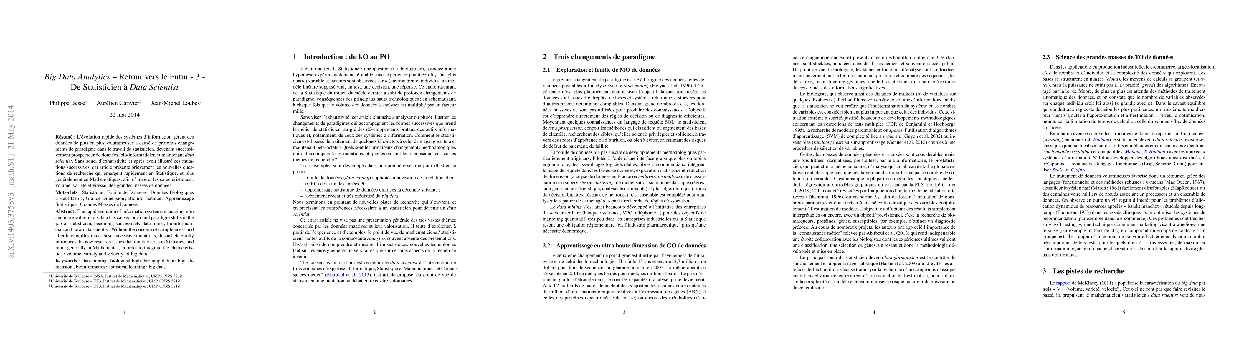 The rapid evolution of information systems managing more and more voluminous data has caused profound paradigm shifts in the job of statistician, becoming successively data miner, bioinformatician and now data scientist. Without the sake of completeness and after having illustrated these successive mutations, this article briefly introduced the new research issues that quickly rise in Statistics, and more generally in Mathematics, in order to integrate the characteristics: volume, variety and velocity, of big data.