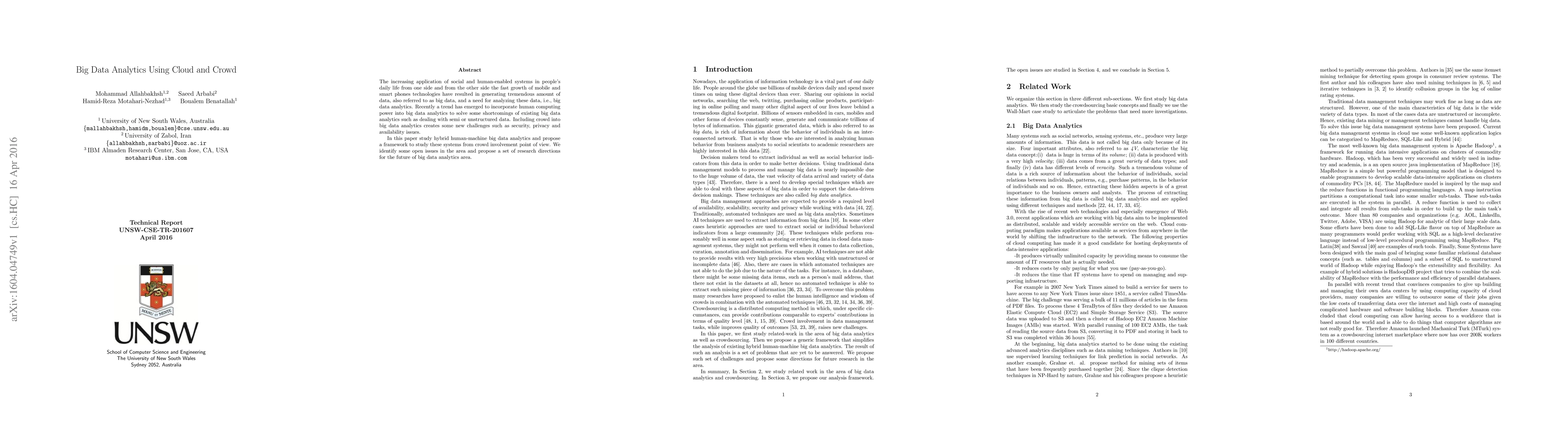 The increasing application of social and human-enabled systems in people's daily life from one side and from the other side the fast growth of mobile and smart phones technologies have resulted in generating tremendous amount of data, also referred to as big data, and a need for analyzing these data, i.e., big data analytics. Recently a trend has emerged to incorporate human computing power into big data analytics to solve some shortcomings of existing big data analytics such as dealing with semi or unstructured data. Including crowd into big data analytics creates some new challenges such as security, privacy and availability issues. In this paper study hybrid human-machine big data analytics and propose a framework to study these systems from crowd involvement point of view. We identify some open issues in the area and propose a set of research directions for the future of big data analytics area.