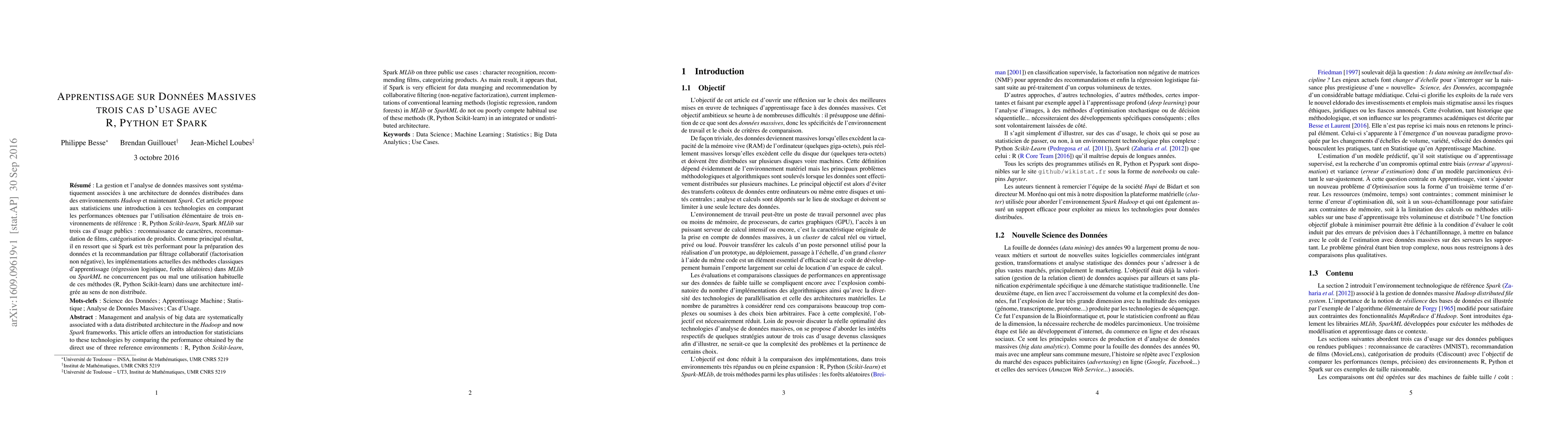 This paper compares the performance of R, Python Scikit-learn, and Spark MLlib on three big data use cases: character recognition, film recommendation, and product categorization. It finds Spark excels in data processing and recommendation systems but conventional machine learning methods in Spark are competitive with R and Python.