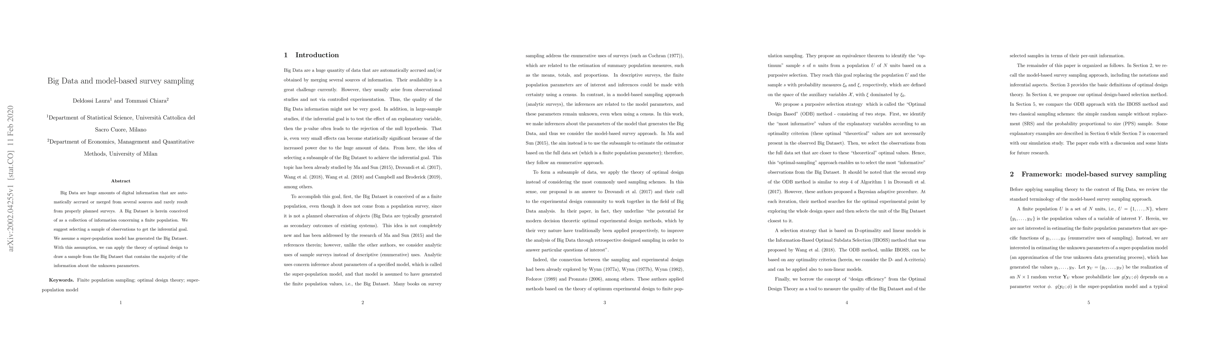 Big Data are huge amounts of digital information that are automatically accrued or merged from several sources and rarely result from properly planned surveys. A Big Dataset is herein conceived of as a collection of information concerning a finite population. We suggest selecting a sample of observations to get the inferential goal. We assume a super-population model has generated the Big Dataset. With this assumption, we can apply the theory of optimal design to draw a sample from the Big Dataset that contains the majority of the information about the unknown parameters.