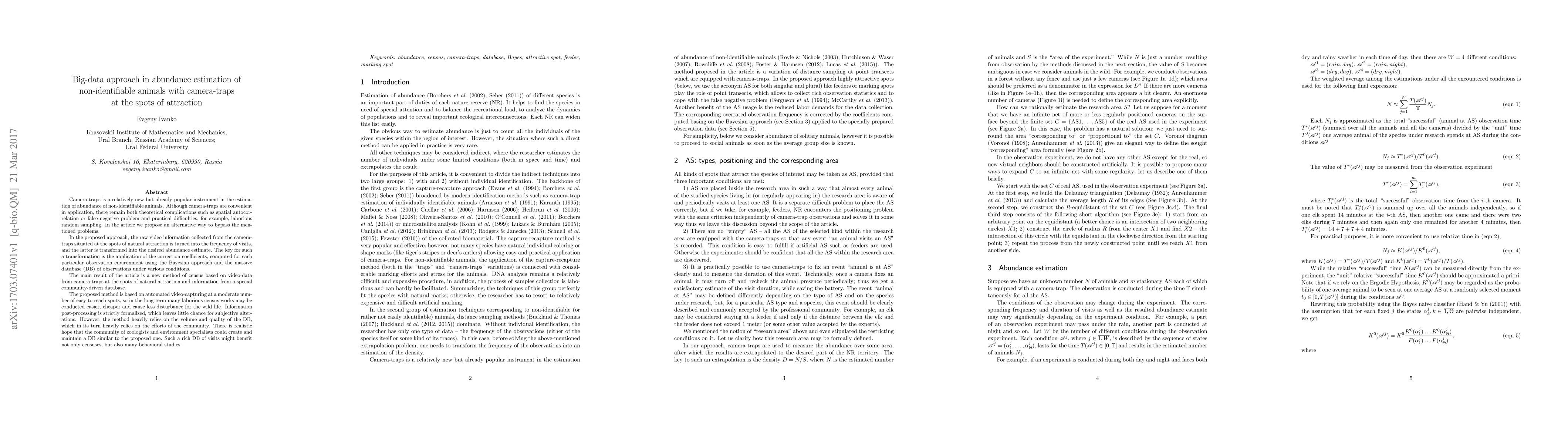 Camera-traps is a relatively new but already popular instrument in the estimation of abundance of non-identifiable animals. Although camera-traps are convenient in application, there remain both theoretical complications such as spatial autocorrelation or false negative problem and practical difficulties, for example, laborious random sampling. In the article we propose an alternative way to bypass the mentioned problems. In the proposed approach, the raw video information collected from the camera-traps situated at the spots of natural attraction is turned into the frequency of visits, and the latter is transformed into the desired abundance estimate. The key for such a transformation is the application of the correction coefficients, computed for each particular observation environment using the Bayesian approach and the massive database (DB) of observations under various conditions. The main result of the article is a new method of census based on video-data from camera-traps at the spots of natural attraction and information from a special community-driven database. The proposed method is based on automated video-capturing at a moderate number of easy to reach spots, so in the long term many laborious census works may be conducted easier, cheaper and cause less disturbance for the wild life. Information post-processing is strictly formalized, which leaves little chance for subjective alterations. However, the method heavily relies on the volume and quality of the DB, which in its turn heavily relies on the efforts of the community. There is realistic hope that the community of zoologists and environment specialists could create and maintain a DB similar to the proposed one. Such a rich DB of visits might benefit not only censuses, but also many behavioral studies.
