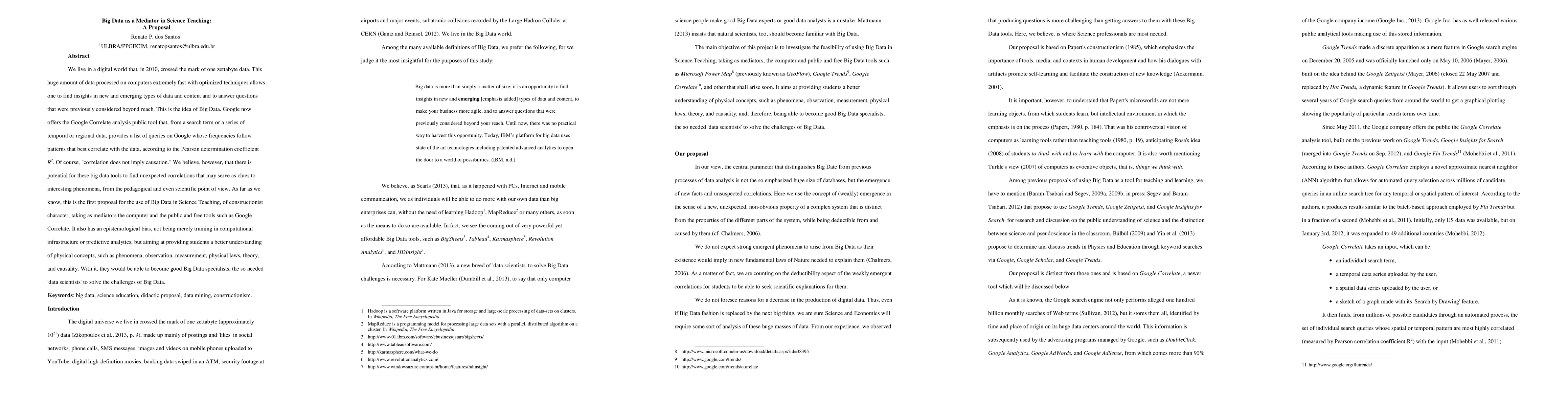 We live in a digital world that, in 2010, crossed the mark of one zettabyte data. This huge amount of data processed on computers extremely fast with optimized techniques allows one to find insights in new and emerging types of data and content and to answer questions that were previously considered beyond reach. This is the idea of Big Data. Google now offers the Google Correlate analysis public tool that, from a search term or a series of temporal or regional data, provides a list of queries on Google whose frequencies follow patterns that best correlate with the data, according to the Pearson determination coefficient R2. Of course, correlation does not imply causation. We believe, however, that there is potential for these big data tools to find unexpected correlations that may serve as clues to interesting phenomena, from the pedagogical and even scientific point of view. As far as we know, this is the first proposal for the use of Big Data in Science Teaching, of constructionist character, taking as mediators the computer and the public and free tools such as Google Correlate. It also has an epistemological bias, not being merely a training in computational infrastructure or predictive analytics, but aiming at providing students a better understanding of physical concepts, such as phenomena, observation, measurement, physical laws, theory, and causality. With it, they would be able to become good Big Data specialists, the so needed 'data scientists' to solve the challenges of Big Data.