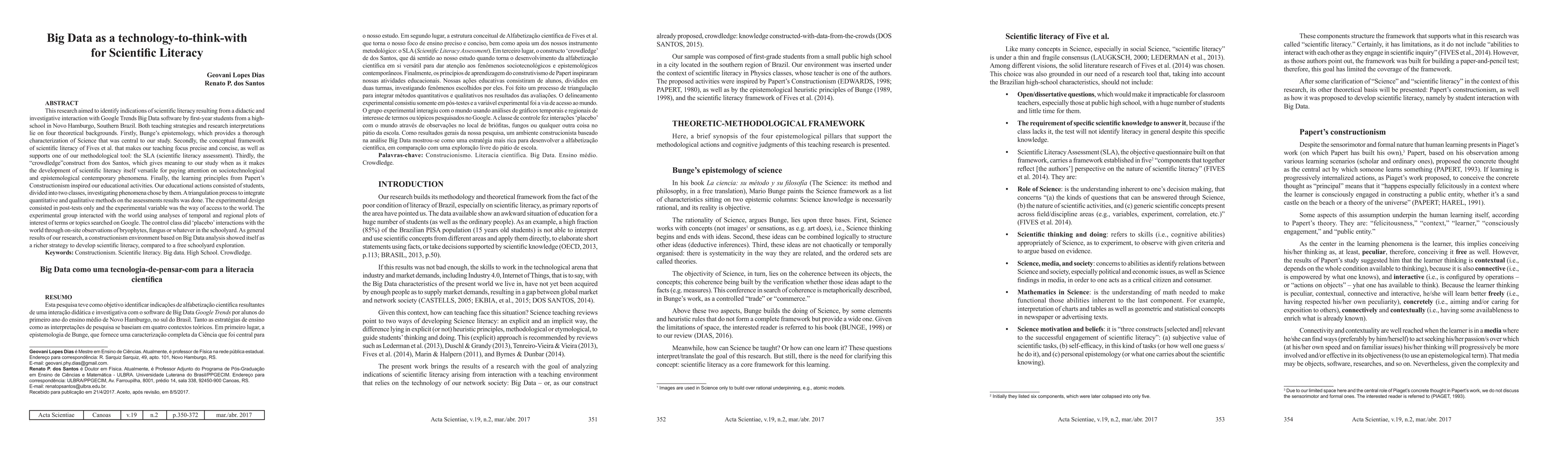 This research explores how first-year high school students in Brazil develop scientific literacy through interaction with Google Trends Big Data software, showing that a constructionist environment based on Big Data analysis is more effective than traditional schoolyard explorations. Theoretical frameworks from Bunge, Fives et al., dos Santos, and Papert underpin the study's methodology and findings.