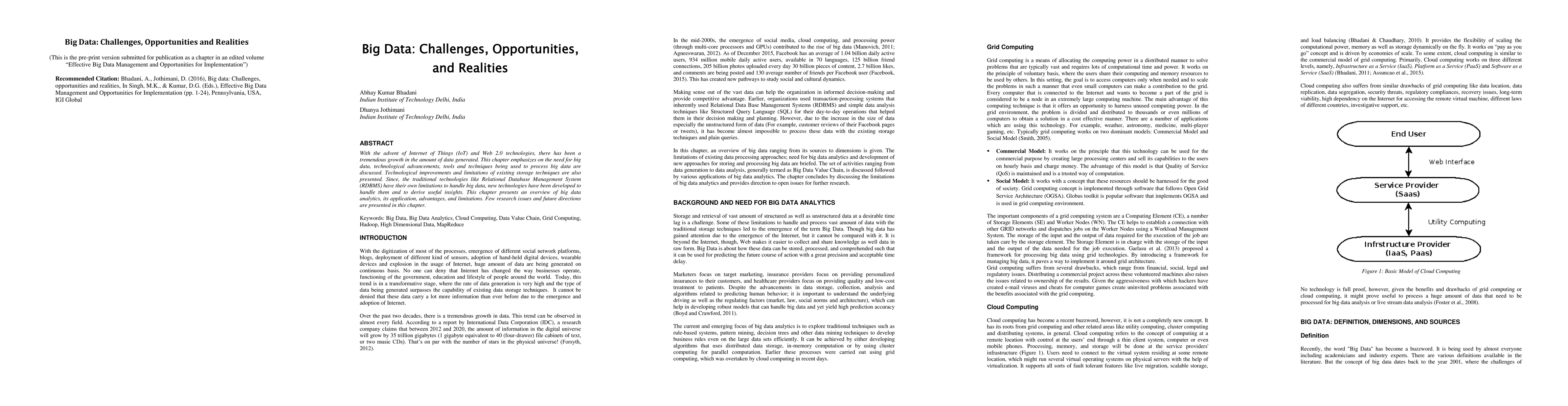 With the advent of Internet of Things (IoT) and Web 2.0 technologies, there has been a tremendous growth in the amount of data generated. This chapter emphasizes on the need for big data, technological advancements, tools and techniques being used to process big data are discussed. Technological improvements and limitations of existing storage techniques are also presented. Since, the traditional technologies like Relational Database Management System (RDBMS) have their own limitations to handle big data, new technologies have been developed to handle them and to derive useful insights. This chapter presents an overview of big data analytics, its application, advantages, and limitations. Few research issues and future directions are presented in this chapter.