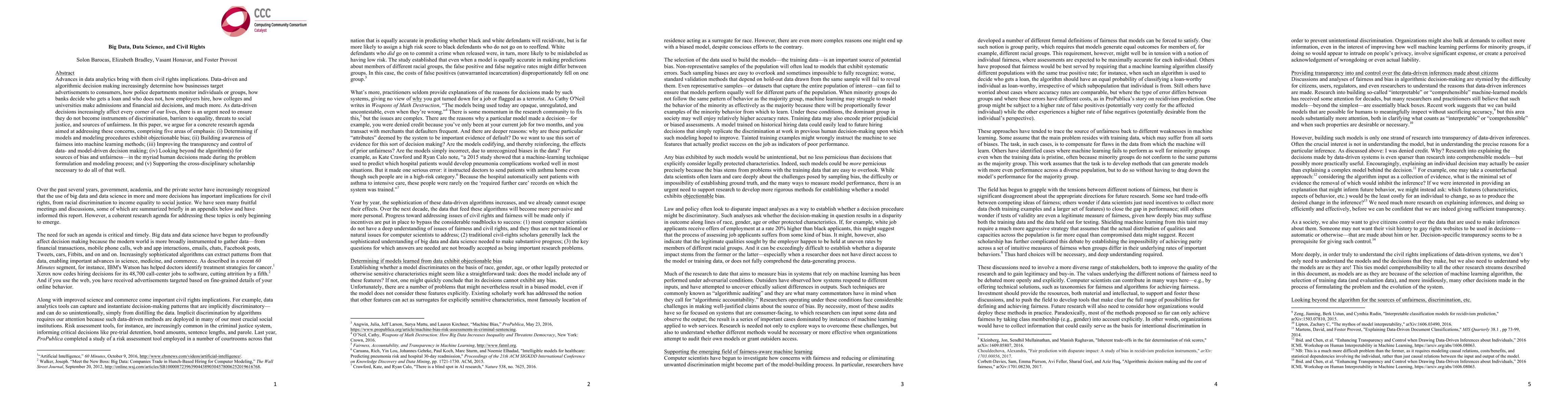 Advances in data analytics bring with them civil rights implications. Data-driven and algorithmic decision making increasingly determine how businesses target advertisements to consumers, how police departments monitor individuals or groups, how banks decide who gets a loan and who does not, how employers hire, how colleges and universities make admissions and financial aid decisions, and much more. As data-driven decisions increasingly affect every corner of our lives, there is an urgent need to ensure they do not become instruments of discrimination, barriers to equality, threats to social justice, and sources of unfairness. In this paper, we argue for a concrete research agenda aimed at addressing these concerns, comprising five areas of emphasis: (i) Determining if models and modeling procedures exhibit objectionable bias; (ii) Building awareness of fairness into machine learning methods; (iii) Improving the transparency and control of data- and model-driven decision making; (iv) Looking beyond the algorithm(s) for sources of bias and unfairness-in the myriad human decisions made during the problem formulation and modeling process; and (v) Supporting the cross-disciplinary scholarship necessary to do all of that well.