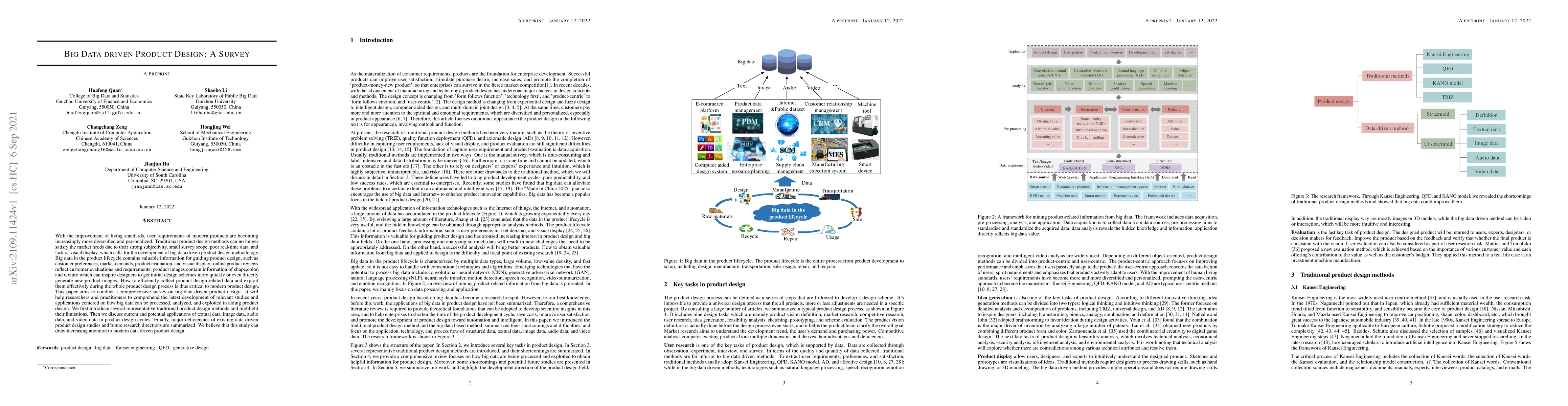 This paper surveys big data driven product design methodologies, highlighting the limitations of traditional methods and exploring how big data from various sources like text, images, audio, and video can enhance the design process. It aims to guide researchers and practitioners in understanding current applications and identifying future research directions.