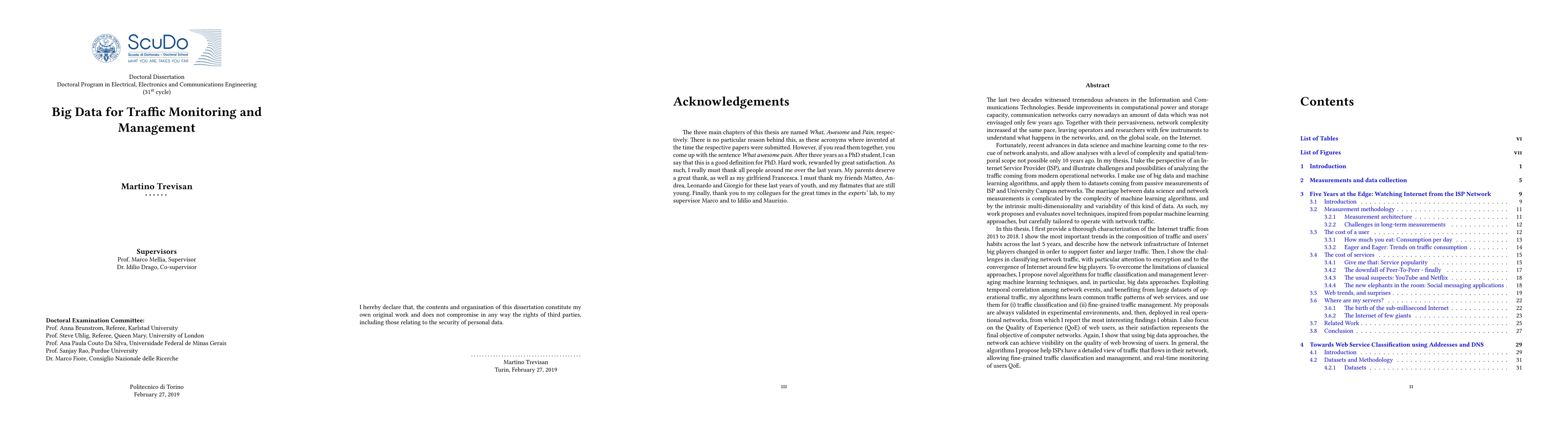 This paper explores the application of big data and machine learning techniques to traffic monitoring and management in modern networks, highlighting the challenges and opportunities presented by the complexity and volume of network data. The author proposes novel, tailored algorithms to analyze passive measurements from ISP and University Campus networks, demonstrating the potential of data science for network analysis.
