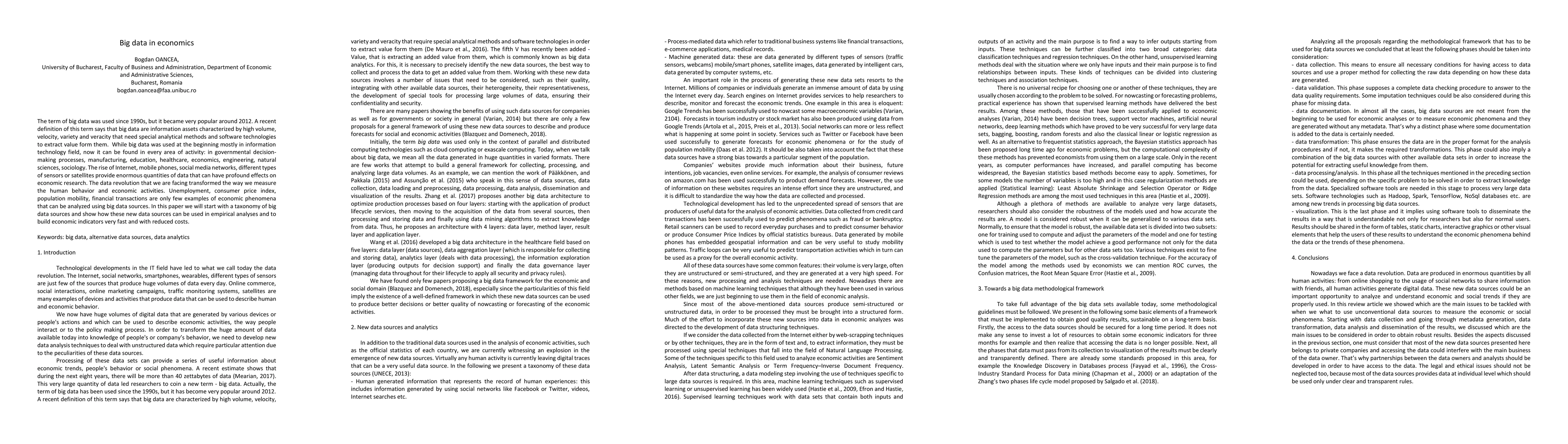 The term of big data was used since 1990s, but it became very popular around 2012. A recent definition of this term says that big data are information assets characterized by high volume, velocity, variety and veracity that need special analytical methods and software technologies to extract value form them. While big data was used at the beginning mostly in information technology field, now it can be found in every area of activity: in governmental decision-making processes, manufacturing, education, healthcare, economics, engineering, natural sciences, sociology. The rise of Internet, mobile phones, social media networks, different types of sensors or satellites provide enormous quantities of data that can have profound effects on economic research. The data revolution that we are facing transformed the way we measure the human behavior and economic activities. Unemployment, consumer price index, population mobility, financial transactions are only few examples of economic phenomena that can be analyzed using big data sources. In this paper we will start with a taxonomy of big data sources and show how these new data sources can be used in empirical analyses and to build economic indicators very fast and with reduced costs.