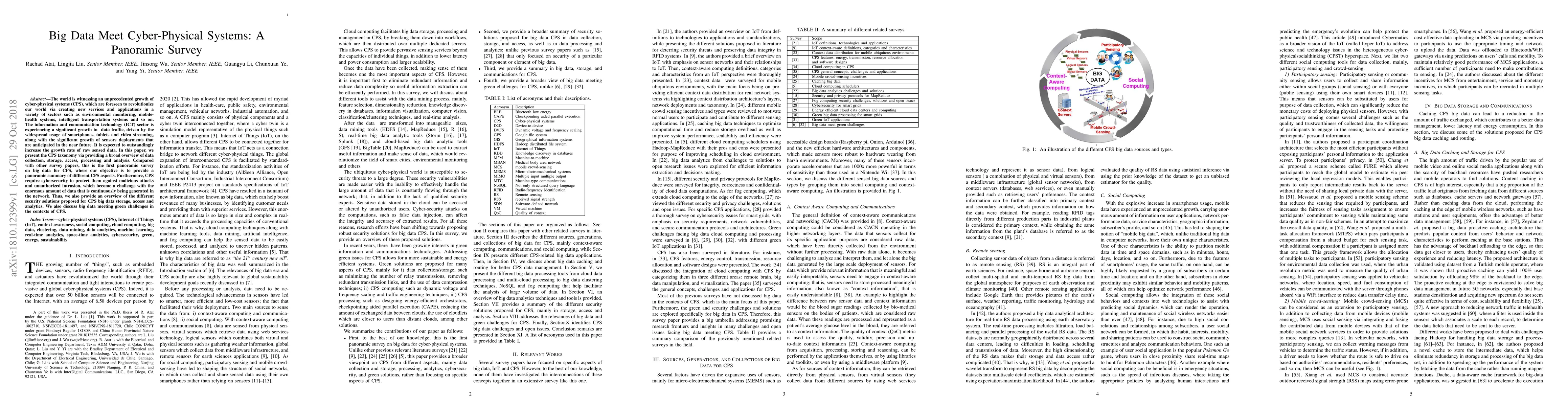 This paper provides a comprehensive survey of cyber-physical systems (CPS) and their integration with big data, covering data collection, storage, processing, and cybersecurity challenges. It also addresses the environmental sustainability aspects of CPS in the big data context.