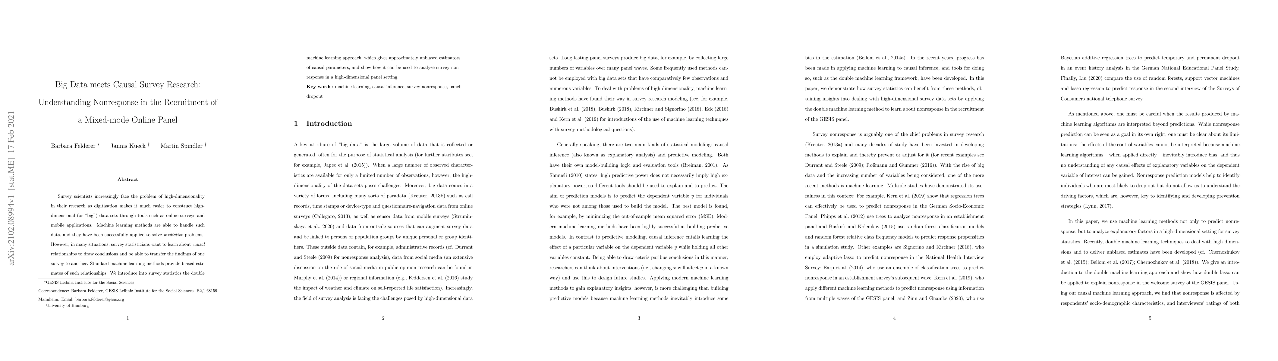 This paper explores the application of double machine learning to address nonresponse in mixed-mode online panel surveys, leveraging big data to obtain unbiased estimates of causal relationships, which traditional machine learning methods often fail to provide. The approach aims to improve the understanding of survey nonresponse in high-dimensional data contexts.