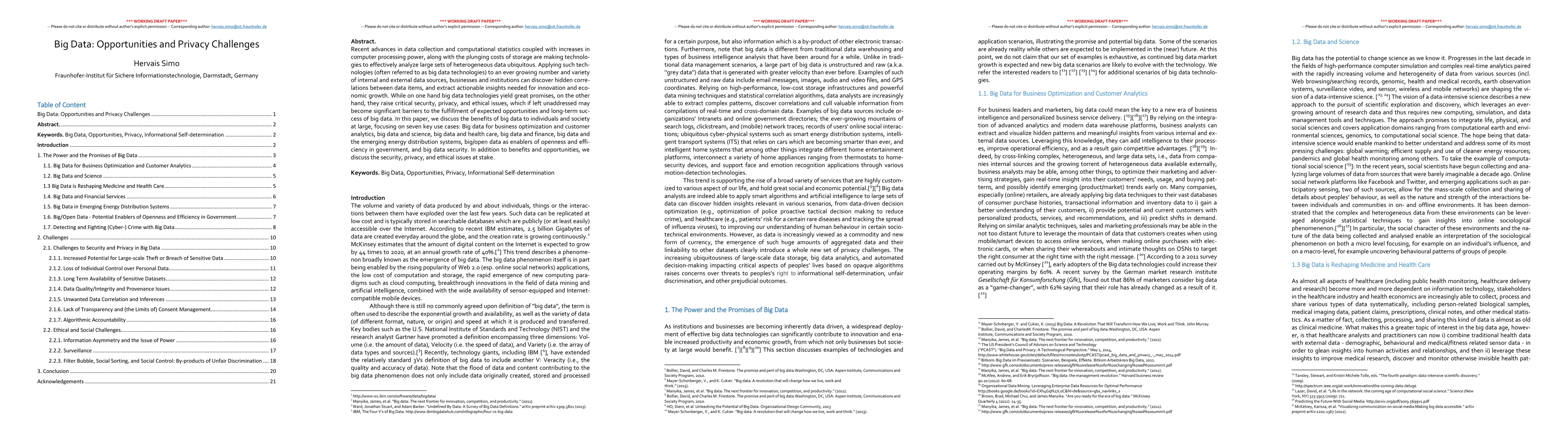 This paper explores the opportunities offered by big data technologies, such as business optimization and scientific discoveries, while also highlighting significant privacy and ethical challenges that could hinder their success. It examines seven key use cases, from healthcare to government efficiency, underscoring the need for addressing these issues to realize big data's full potential.