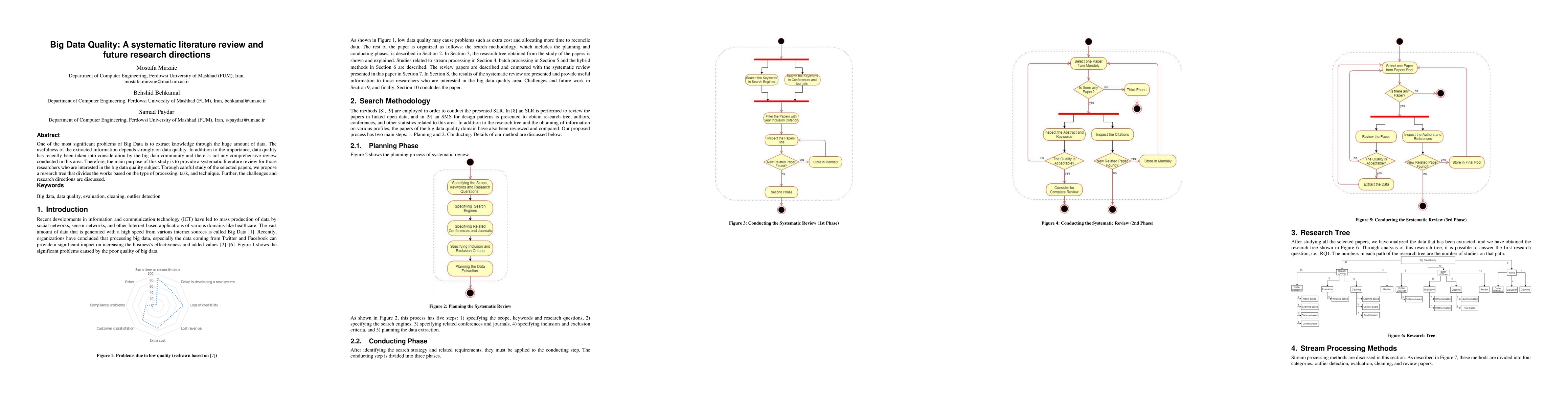 This study conducted a systematic literature review focusing on big data quality, analyzing 88 research papers through a hierarchical framework covering processing types (stream, batch, hybrid), tasks, and methods. The review also compared and critically reviewed the selected studies to identify successful data quality assessment methods adopted by the big data community.