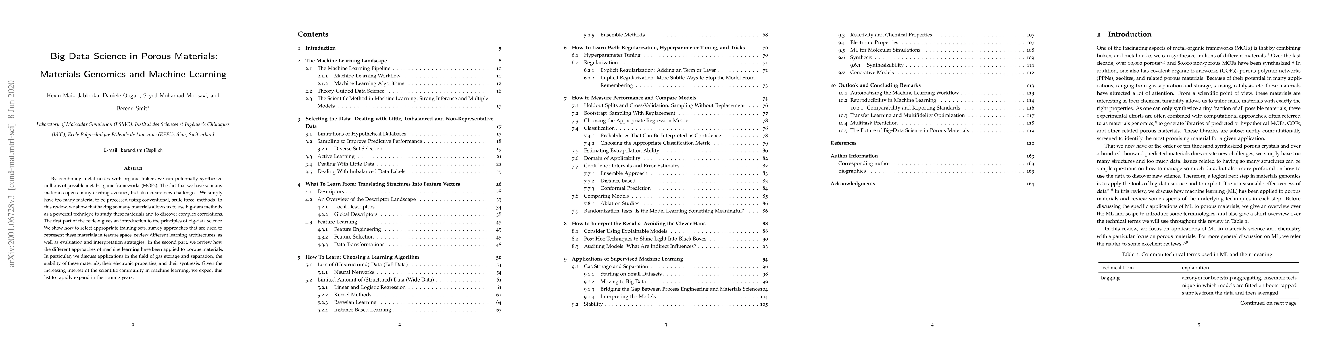 This paper reviews the application of big-data science and machine learning (ML) to the study of porous materials, specifically metal organic frameworks (MOFs). The review emphasizes data collection, feature representation, and supervised ML techniques to optimize material properties for various applications, including gas storage, stability, electronic properties, and synthesis.