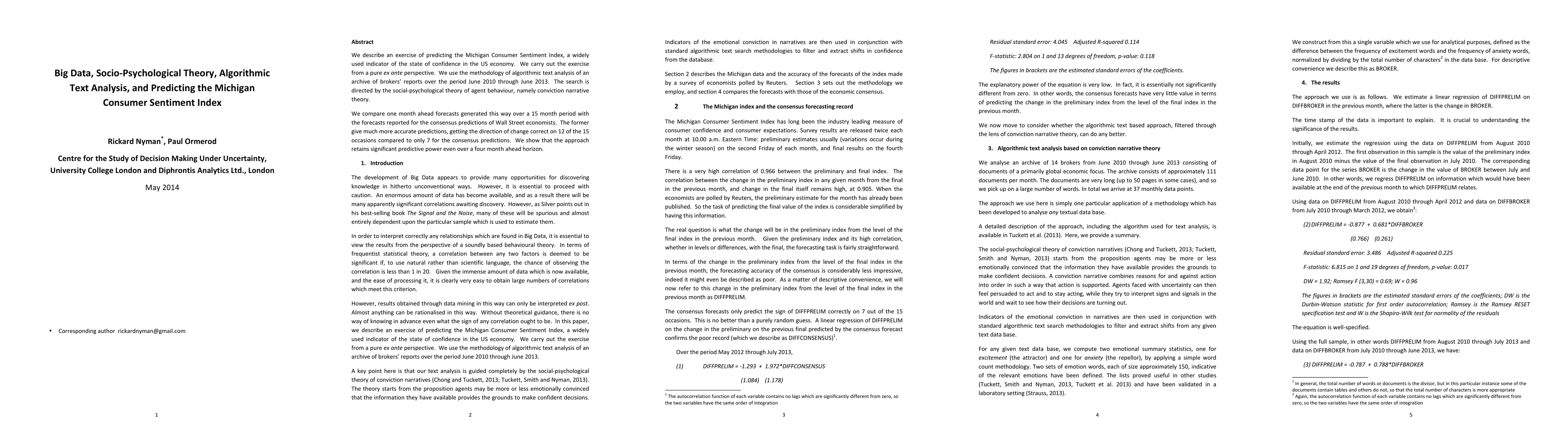 We describe an exercise of using Big Data to predict the Michigan Consumer Sentiment Index, a widely used indicator of the state of confidence in the US economy. We carry out the exercise from a pure ex ante perspective. We use the methodology of algorithmic text analysis of an archive of brokers' reports over the period June 2010 through June 2013. The search is directed by the social-psychological theory of agent behaviour, namely conviction narrative theory. We compare one month ahead forecasts generated this way over a 15 month period with the forecasts reported for the consensus predictions of Wall Street economists. The former give much more accurate predictions, getting the direction of change correct on 12 of the 15 occasions compared to only 7 for the consensus predictions. We show that the approach retains significant predictive power even over a four month ahead horizon.
