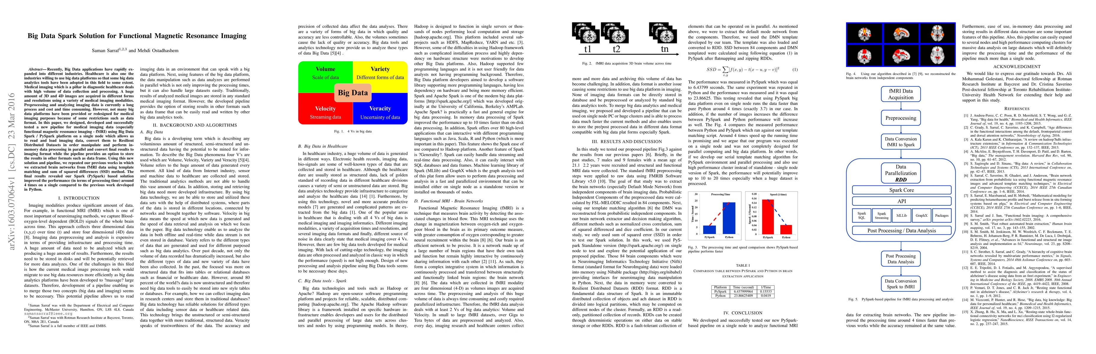 Recently, Big Data applications have rapidly expanded into different industries. Healthcare is also one the industries willing to use big data platforms so that some big data analytics tools have been adopted in this field to some extent. Medical imaging which is a pillar in diagnostic healthcare deals with high volume of data collection and processing. A huge amount of 3D and 4D images are acquired in different forms and resolutions using a variety of medical imaging modalities. Preprocessing and analyzing imaging data is currently a long process and cost and time consuming. However, not many big data platforms have been provided or redesigned for medical imaging purposes because of some restrictions such as data format. In this paper, we designed, developed and successfully tested a new pipeline for medical imaging data (especially functional magnetic resonance imaging - fMRI) using Big Data Spark / PySpark platform on a single node which allows us to read and load imaging data, convert them to Resilient Distributed Datasets in order manipulate and perform in-memory data processing in parallel and convert final results to imaging format while the pipeline provides an option to store the results in other formats such as data frame. Using this new solution and pipeline, we repeated our previous works in which we extracted brain networks from fMRI data using template matching and sum of squared differences (SSD) method. The final results revealed our Spark (PySpark) based solution improved the performance (in terms of processing time) around 4 times on a single compared to the previous work developed in Python.
