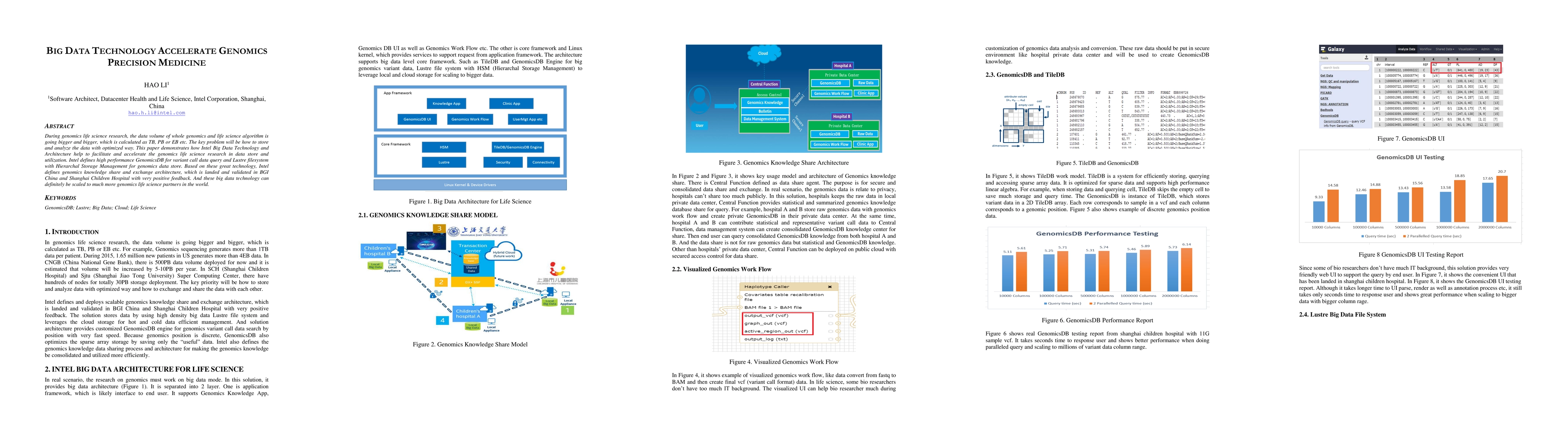 During genomics life science research, the data volume of whole genomics and life science algorithm is going bigger and bigger, which is calculated as TB, PB or EB etc. The key problem will be how to store and analyze the data with optimized way. This paper demonstrates how Intel Big Data Technology and Architecture help to facilitate and accelerate the genomics life science research in data store and utilization. Intel defines high performance GenomicsDB for variant call data query and Lustre filesystem with Hierarchal Storage Management for genomics data store. Based on these great technology, Intel defines genomics knowledge share and exchange architecture, which is landed and validated in BGI China and Shanghai Children Hospital with very positive feedback. And these big data technology can definitely be scaled to much more genomics life science partners in the world.