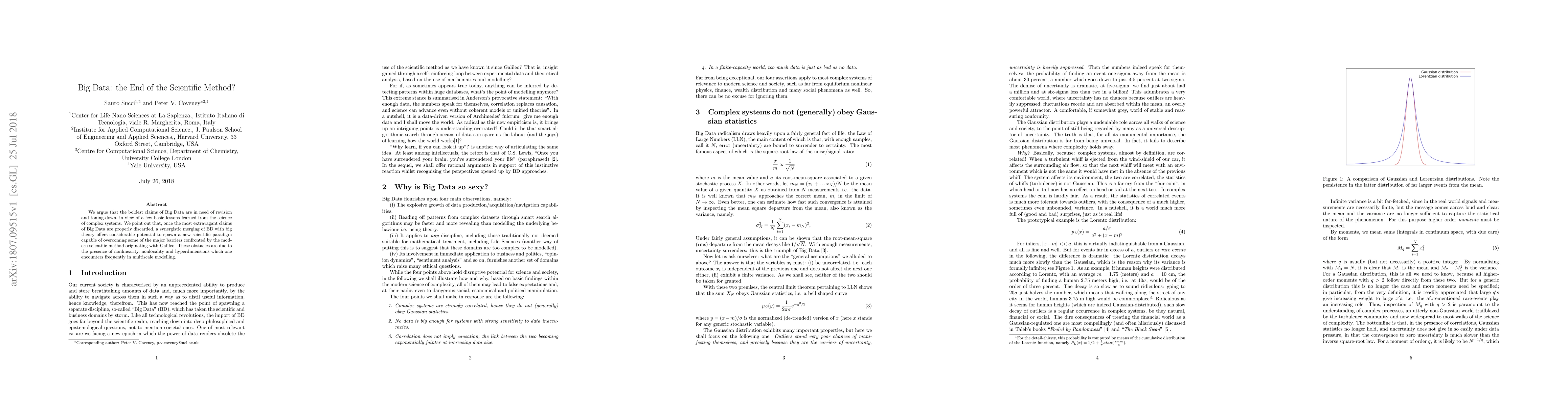 We argue that the boldest claims of Big Data are in need of revision and toning-down, in view of a few basic lessons learned from the science of complex systems. We point out that, once the most extravagant claims of Big Data are properly discarded, a synergistic merging of BD with big theory offers considerable potential to spawn a new scientific paradigm capable of overcoming some of the major barriers confronted by the modern scientific method originating with Galileo. These obstacles are due to the presence of nonlinearity, nonlocality and hyperdimensions which one encounters frequently in multiscale modelling.