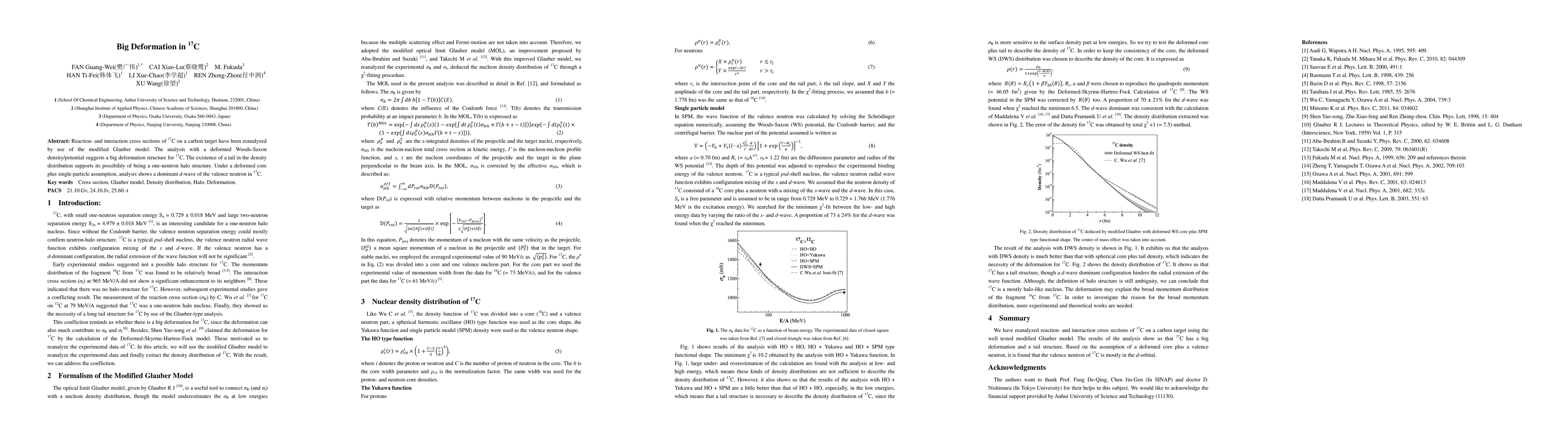 Reaction- and interaction cross sections of 17C on a carbon target have been reanalyzed by use of the modified Glauber model. The analysis with a deformed Woods-Saxon density/potential suggests a big deformation structure for 17C. The existence of a tail in the density distribution supports its possibility of being a one-neutron halo structure. Under a deformed core plus single-particle assumption, analysis shows a dominant d-wave of the valence neutron in 17C. Key words Cross section, Glauber model, Density distribution, Halo, Deformation.