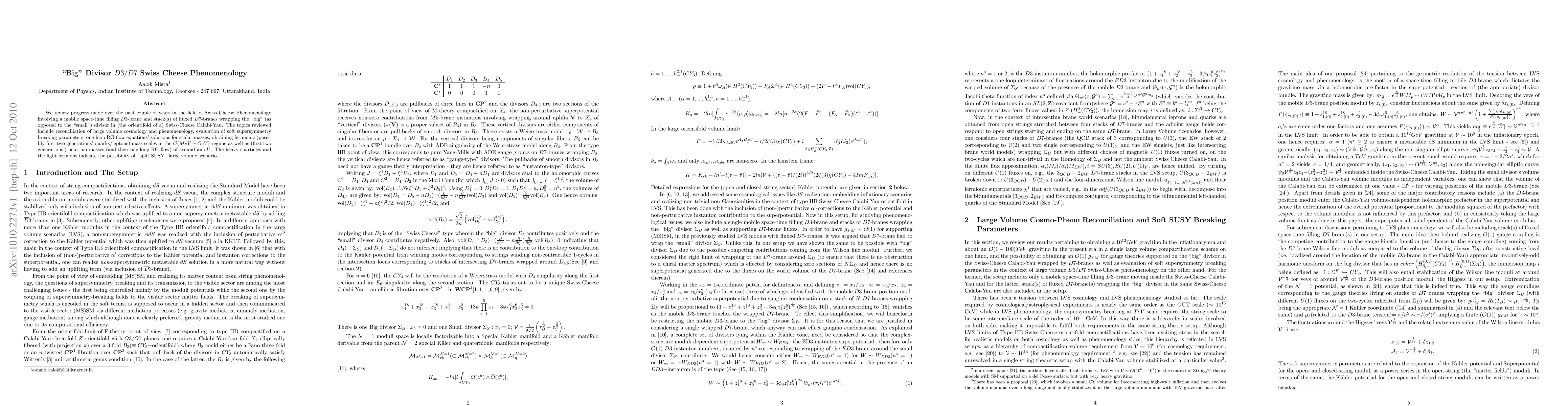 We review progress made over the past couple of years in the field of Swiss Cheese Phenomenology involving a mobile space-time filling D3-brane and stack(s) of fluxed D7-branes wrapping the "big" (as opposed to the "small") divisor in (the orientifold of a) Swiss-Cheese Calabi-Yau. The topics reviewed include reconciliation of large volume cosmology and phenomenology, evaluation of soft supersymmetry breaking parameters, one-loop RG-flow equations' solutions for scalar masses, obtaining fermionic (possibly first two generations' quarks/leptons) mass scales in the O(MeV-GeV)-regime as well as (first two generations') neutrino masses (and their one-loop RG flow) of around an eV. The heavy sparticles and the light fermions indicate the possibility of "split SUSY" large volume scenario.