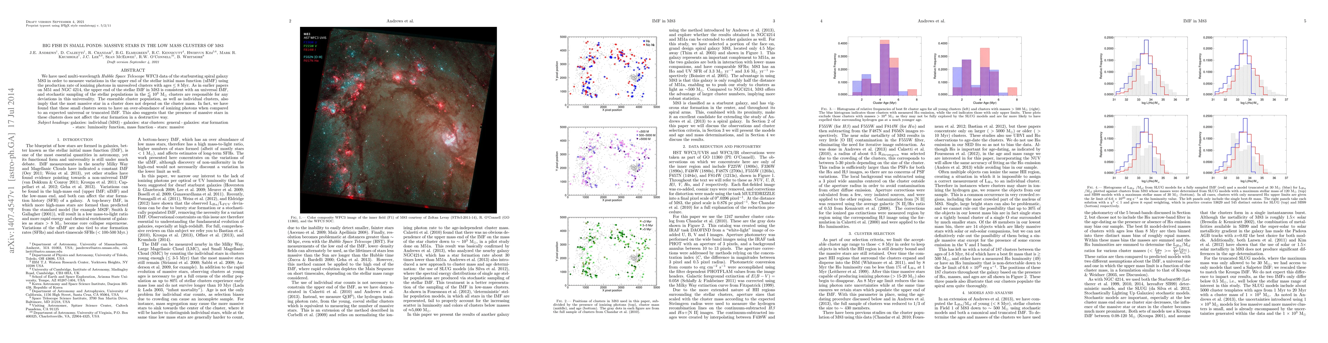 We have used multi-wavelength Hubble Space Telescope WFC3 data of the starbursting spiral galaxy M83 in order to measure variations in the upper end of the stellar initial mass function (uIMF) using the production rate of ionizing photons in unresolved clusters with ages $\leq$ 8 Myr. As in earlier papers on M51 and NGC 4214, the upper end of the stellar IMF in M83 is consistent with an universal IMF, and stochastic sampling of the stellar populations in the $\lessapprox$ 10$^{3}$ Msun clusters are responsible for any deviations in this universality. The ensemble cluster population, as well as individual clusters, also imply that the most massive star in a cluster does not depend on the cluster mass. In fact, we have found that these small clusters seem to have an over-abundance of ionizing photons when compared to an expected universal or truncated IMF. This also suggests that the presence of massive stars in these clusters does not affect the star formation in a destructive way.