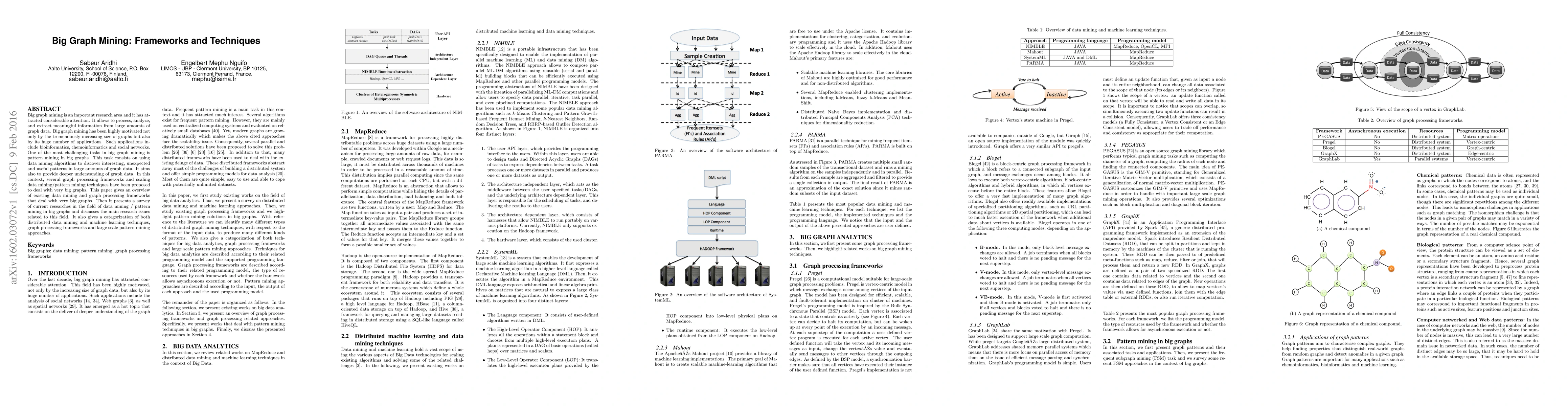 This paper provides an overview of frameworks and techniques for big graph mining, focusing on data mining and graph processing methods for handling large graph datasets. It categorizes distributed data mining and machine learning techniques, graph processing frameworks, and large-scale pattern mining approaches, discussing key research issues in the field.