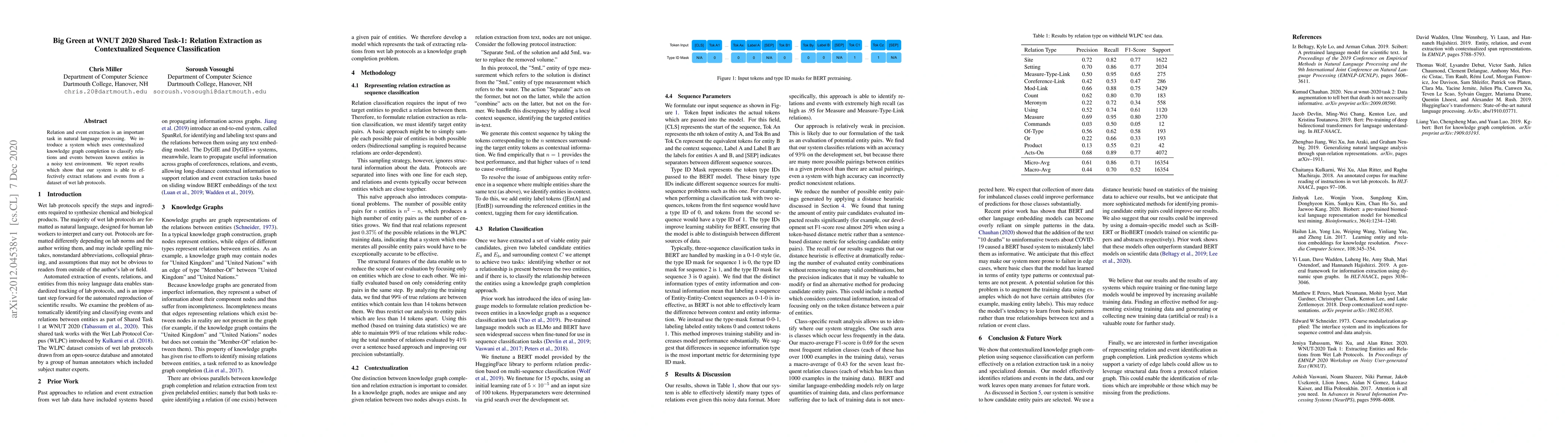 Relation and event extraction is an important task in natural language processing. We introduce a system which uses contextualized knowledge graph completion to classify relations and events between known entities in a noisy text environment. We report results which show that our system is able to effectively extract relations and events from a dataset of wet lab protocols.