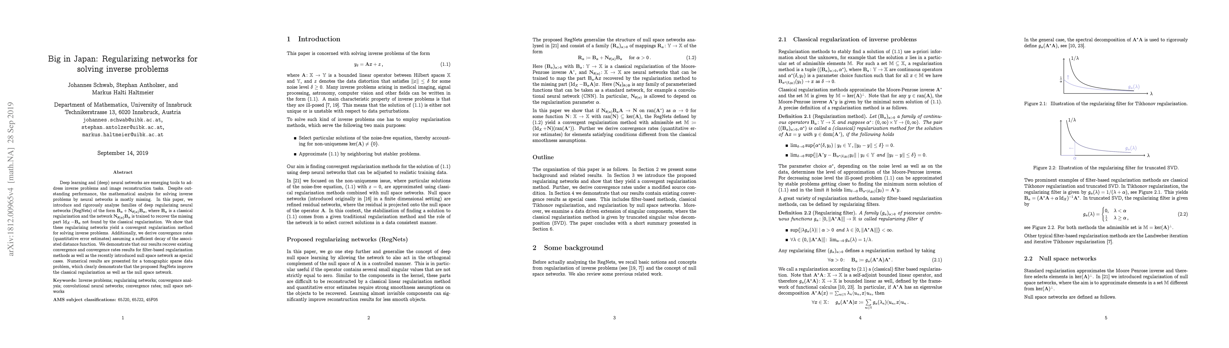 This paper introduces deep regularizing neural networks (RegNets) to solve inverse problems, rigorously analyzing their convergence and deriving quantitative error estimates. The proposed method combines classical regularization with neural networks to improve reconstruction, demonstrating superior performance over classical methods and null space networks in numerical experiments.