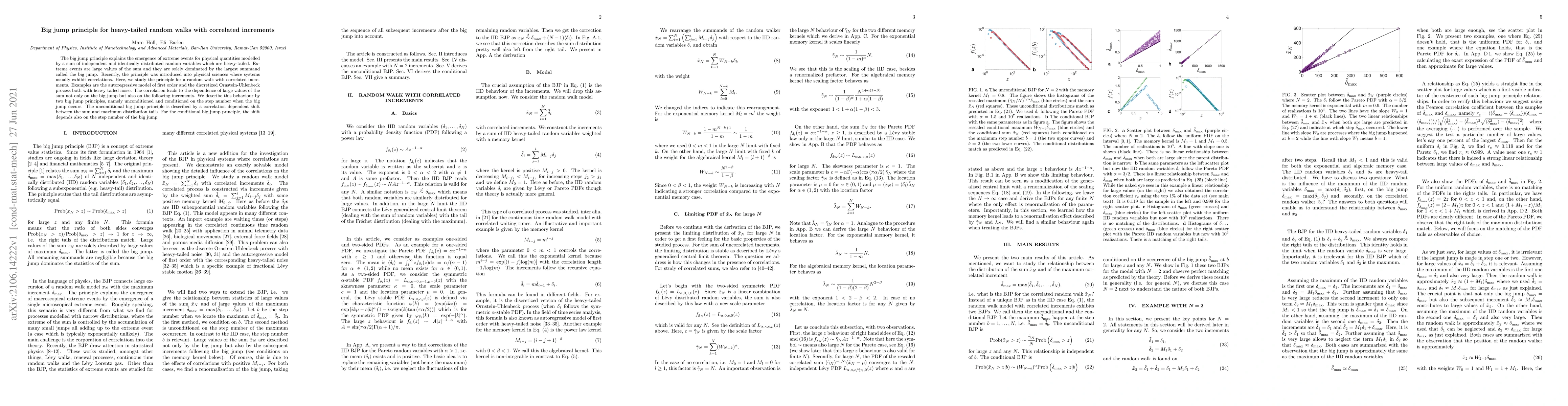 The paper presents detailed mathematical derivations and examples to describe two big jump principles for correlated heavy-tailed random walks, extending the well-known big jump principle for independent and identically distributed random variables.