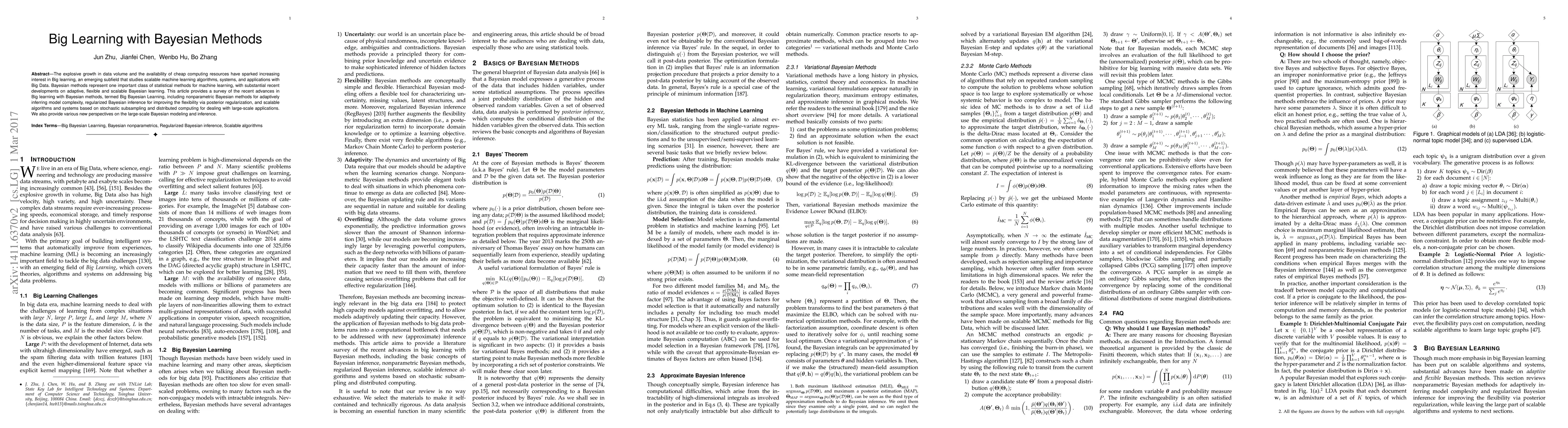 This paper surveys recent advances in Big Bayesian Learning, focusing on scalable Bayesian methods for handling large datasets. It highlights developments in nonparametric Bayesian methods, regularized Bayesian inference, and scalable algorithms leveraging stochastic subsampling and distributed computing.