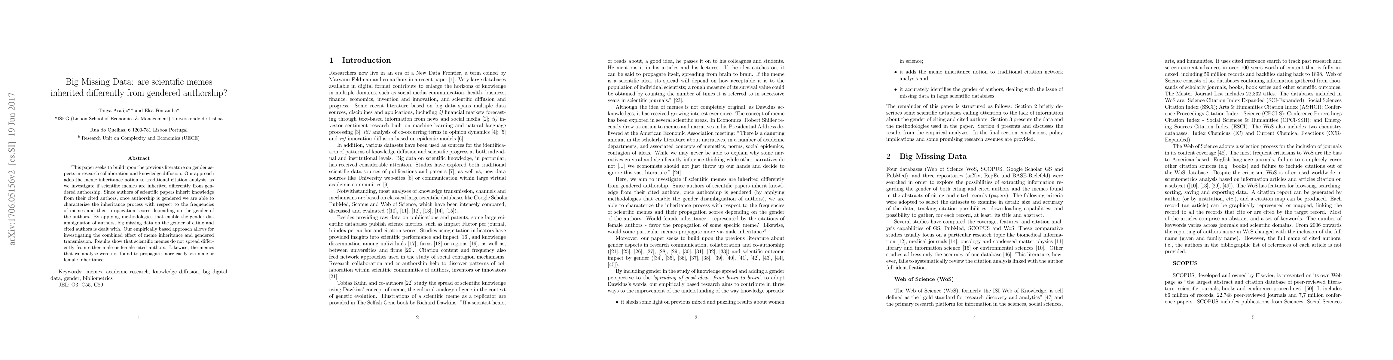 This paper investigates whether scientific memes are inherited differently from gendered authorship, finding that meme propagation does not vary based on the gender of citing or cited authors. The study addresses missing gender data and concludes that meme inheritance and gendered transmission are similar across genders.