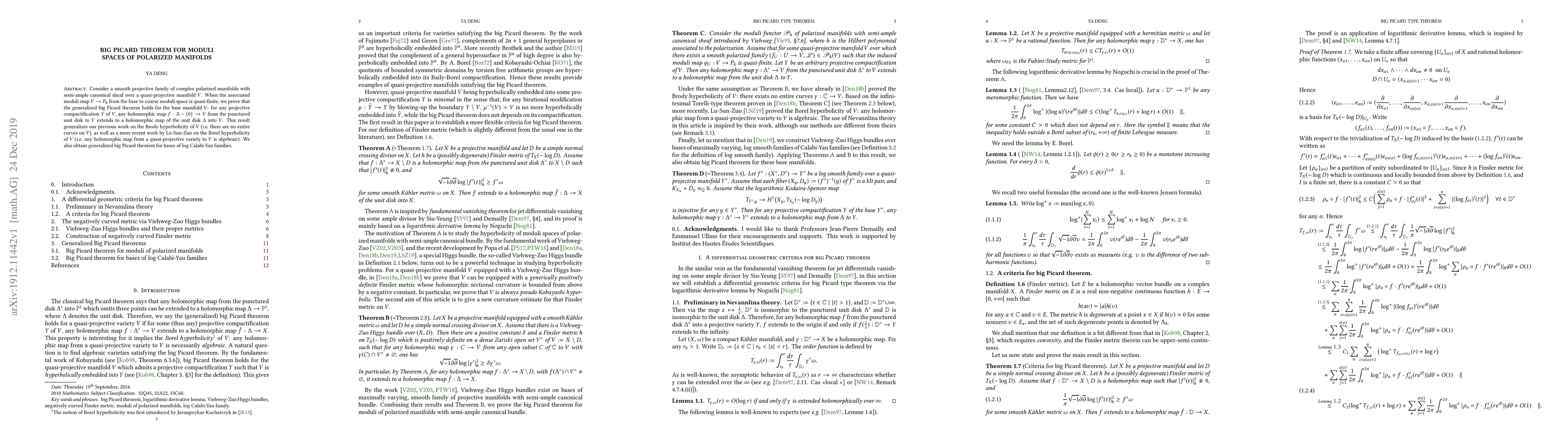 Consider a smooth projective family of complex polarized manifolds with semi-ample canonical sheaf over a quasi-projective manifold $V$. When the associated moduli map $V\to P_h$ from the base to coarse moduli space is quasi-finite, we prove that the generalized big Picard theorem holds for the base manifold $V$: for any projective compactification $Y$ of $V$, any holomorphic map $f:\Delta-\{0\}\to V$ from the punctured unit disk to $V$ extends to a holomorphic map of the unit disk $\Delta$ into $Y$. This result generalizes our previous work on the Brody hyperbolicity of $V$ (i.e. there are no entire curves on $V$), as well as a more recent work by Lu-Sun-Zuo on the Borel hyperbolicity of $V$ (i.e. any holomorphic map from a quasi-projective variety to $V$ is algebraic). We also obtain generalized big Picard theorem for bases of log Calabi-Yau families.