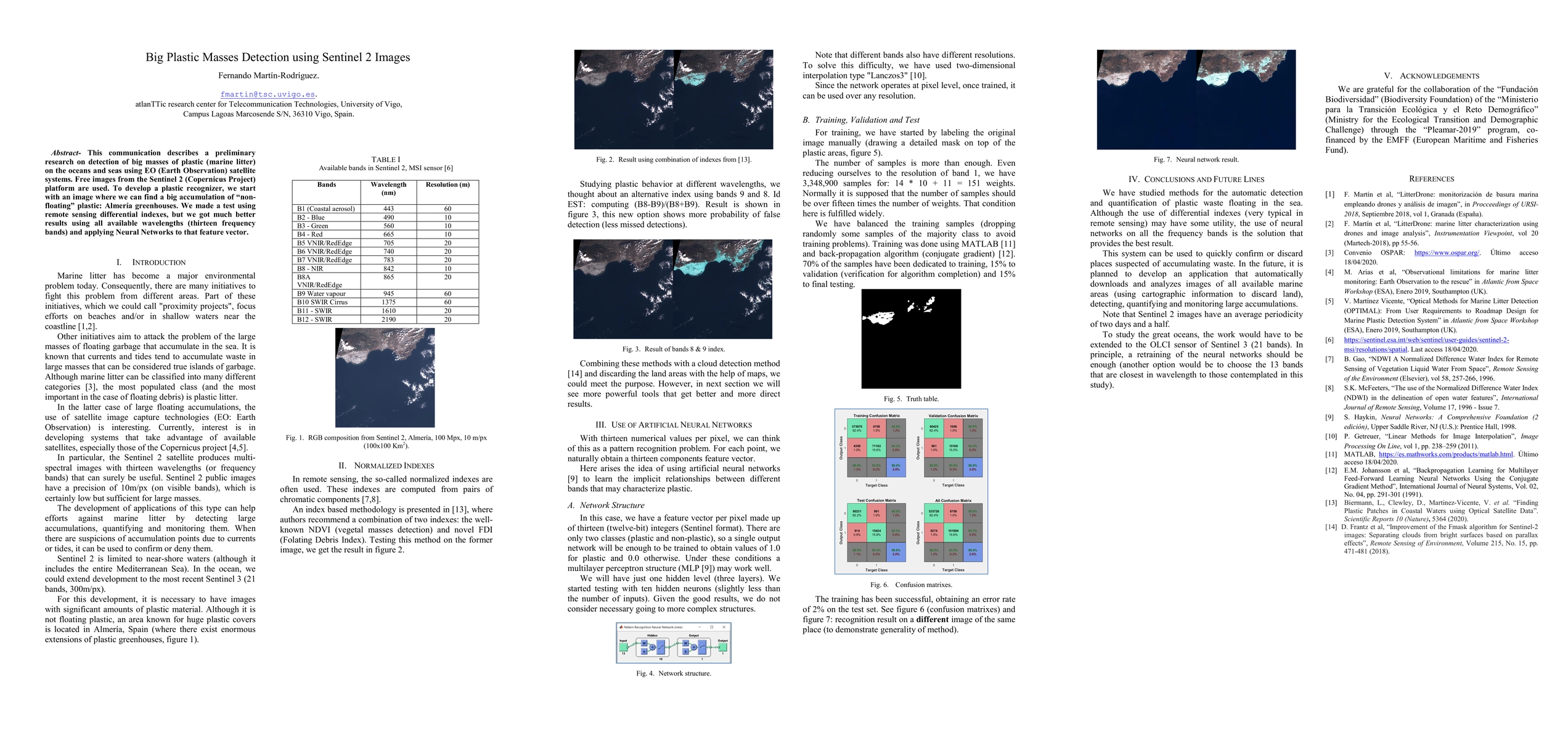 This communication describes a preliminary research on detection of big masses of plastic (marine litter) on the oceans and seas using EO (Earth Observation) satellite systems. Free images from the Sentinel 2 (Copernicus Project) platform are used. To develop a plastic recognizer, we start with an image where we can find a big accumulation of "nonfloating" plastic: Almer\'ia greenhouses. We made a test using remote sensing differential indexes, but we got much better results using all available wavelengths (thirteen frequency bands) and applying Neural Networks to that feature vector.
