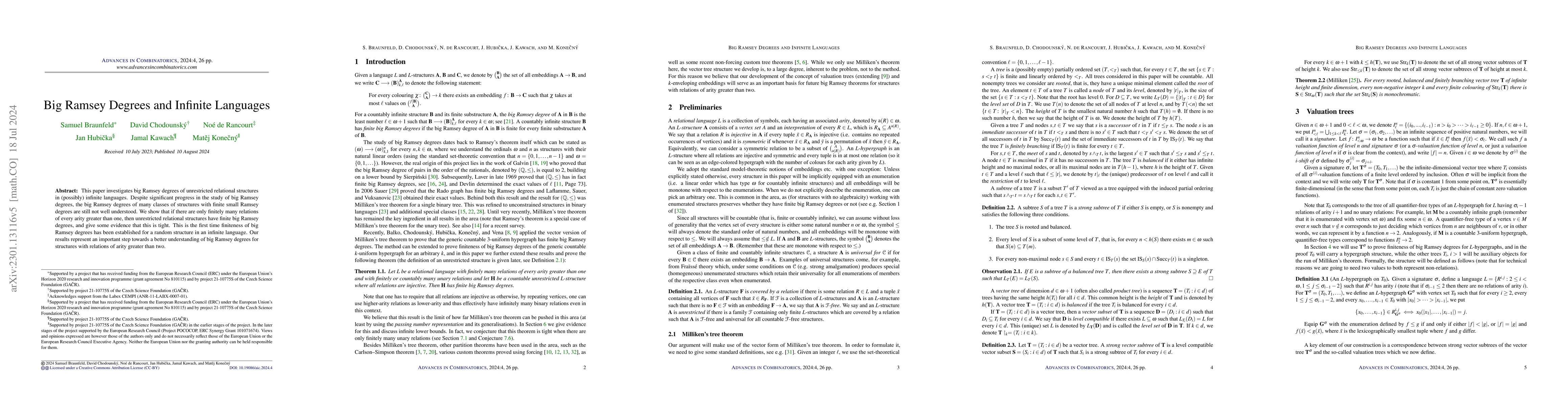 This paper establishes that unrestricted relational structures with only finitely many relations of arity greater than one have finite big Ramsey degrees, marking the first such result for infinite-language random structures. The findings suggest this result may be tight and advance understanding of big Ramsey degrees in higher-arity relational structures.