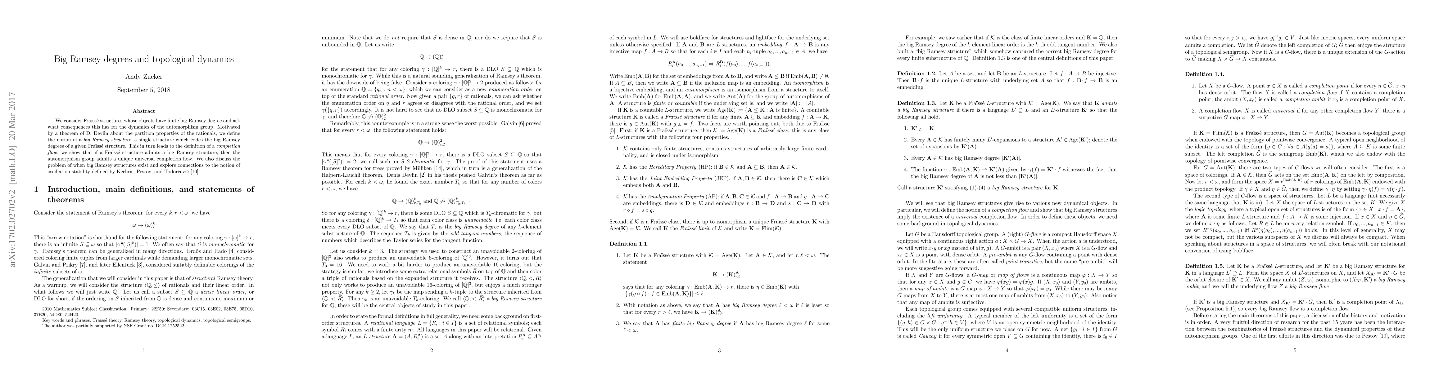 We consider Fra\"iss\'e structures whose objects have finite big Ramsey degree and ask what consequences this has for the dynamics of the automorphism group. Motivated by a theorem of D. Devlin about the partition properties of the rationals, we define the notion of a big Ramsey structure, a single structure which codes the big Ramsey degrees of a given Fra\"iss\'e structure. This in turn leads to the definition of a completion flow; we show that if a Fra\"iss\'e structure admits a big Ramsey structure, then the automorphism group admits a unique universal completion flow. We also discuss the problem of when big Ramsey structures exist and explore connections to the notion of oscillation stability defined by Kechris, Pestov, and Todor\v{c}evi\'c
