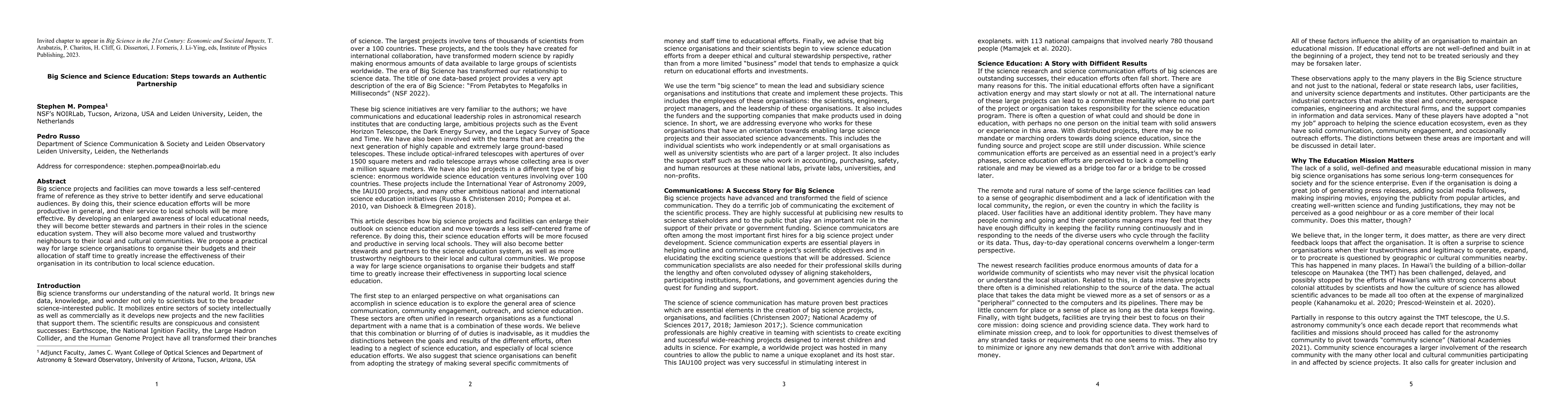This paper proposes that big science projects enhance their educational impact by shifting focus to better serve local schools, thereby fostering authentic partnerships and becoming more valued community members. It suggests practical budget and staff allocation strategies for large science organizations to improve their contribution to local science education.