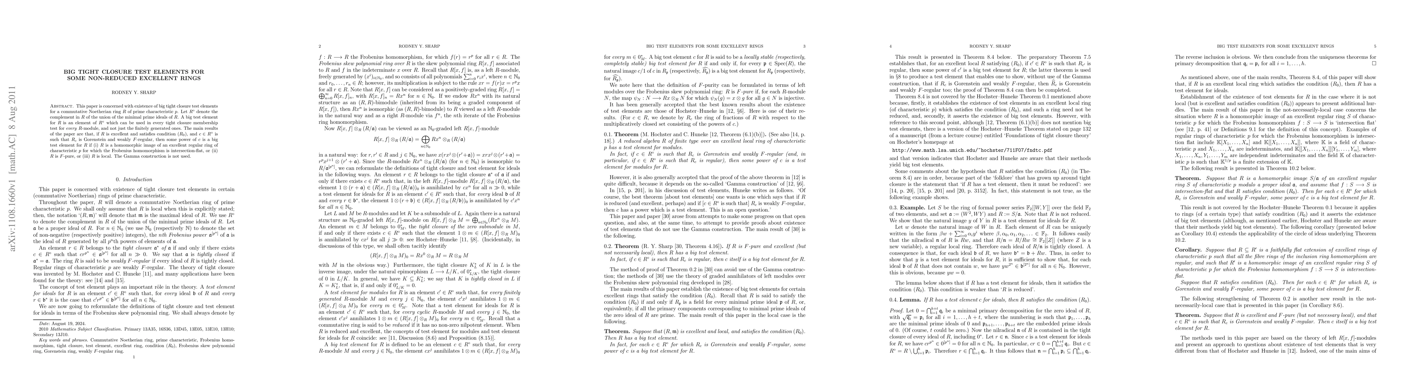 This paper investigates the existence of big tight closure test elements in certain non-reduced excellent rings of prime characteristic $p$. It concludes that under specific conditions, such as being a homomorphic image of an intersection-flat regular ring or being $F$-pure, a power of a particular element in the complement of minimal primes can serve as a big test element for tight closure tests across all $R$-modules.