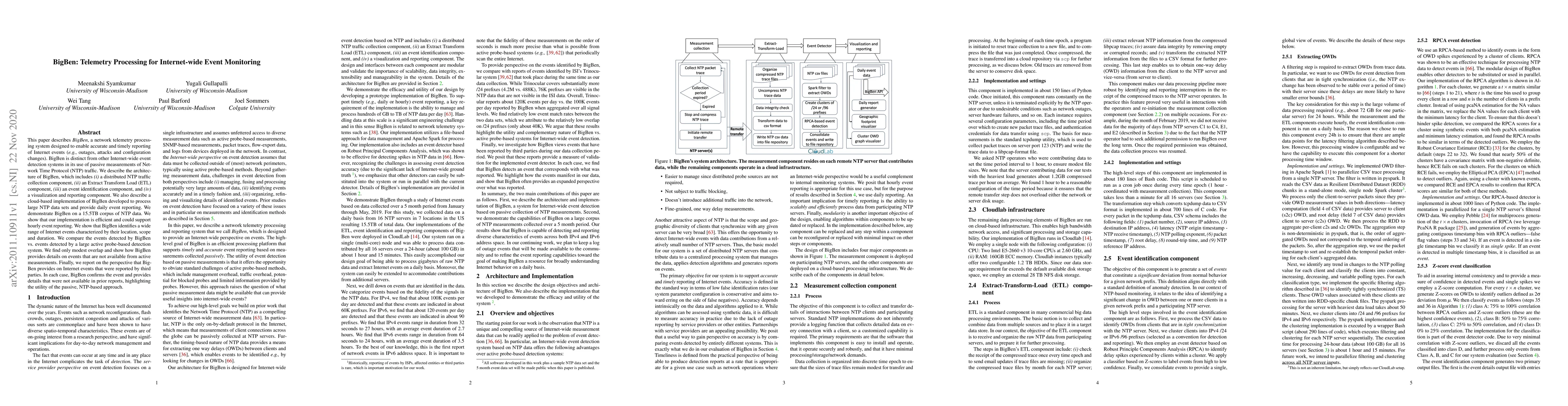 This paper describes BigBen, a network telemetry processing system designed to enable accurate and timely reporting of Internet events (e.g., outages, attacks and configuration changes). BigBen is distinct from other Internet-wide event detection systems in its use of passive measurements of Network Time Protocol (NTP) traffic. We describe the architecture of BigBen, which includes (i) a distributed NTP traffic collection component, (ii) an Extract Transform Load (ETL) component, (iii) an event identification component, and (iv) a visualization and reporting component. We also describe a cloud-based implementation of BigBen developed to process large NTP data sets and provide daily event reporting. We demonstrate BigBen on a 15.5TB corpus of NTP data. We show that our implementation is efficient and could support hourly event reporting. We show that BigBen identifies a wide range of Internet events characterized by their location, scope and duration. We compare the events detected by BigBen vs. events detected by a large active probe-based detection system. We find only modest overlap and show how BigBen provides details on events that are not available from active measurements. Finally, we report on the perspective that BigBen provides on Internet events that were reported by third parties. In each case, BigBen confirms the event and provides details that were not available in prior reports, highlighting the utility of the passive, NTP-based approach.