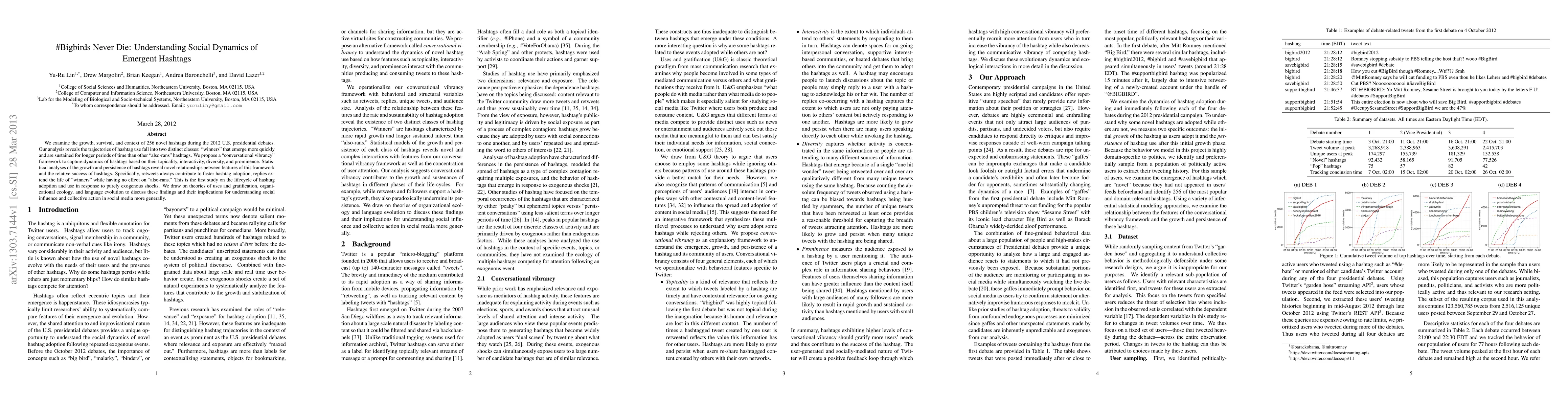 This study analyzes 256 hashtags from 2012 U.S. presidential debates, identifying 'winners' and 'also-rans' based on their growth and persistence. It proposes a 'conversational vibrancy' framework, finding that retweets accelerate hashtag adoption, and replies prolong 'winner' hashtags' life, with implications for understanding social influence and collective action in social media.