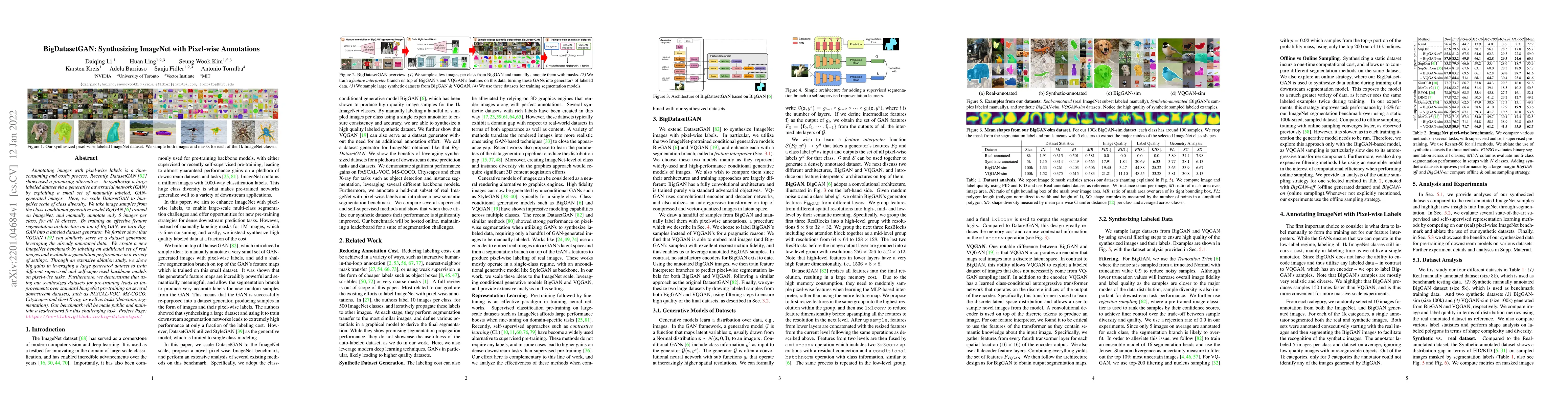 Annotating images with pixel-wise labels is a time-consuming and costly process. Recently, DatasetGAN showcased a promising alternative - to synthesize a large labeled dataset via a generative adversarial network (GAN) by exploiting a small set of manually labeled, GAN-generated images. Here, we scale DatasetGAN to ImageNet scale of class diversity. We take image samples from the class-conditional generative model BigGAN trained on ImageNet, and manually annotate 5 images per class, for all 1k classes. By training an effective feature segmentation architecture on top of BigGAN, we turn BigGAN into a labeled dataset generator. We further show that VQGAN can similarly serve as a dataset generator, leveraging the already annotated data. We create a new ImageNet benchmark by labeling an additional set of 8k real images and evaluate segmentation performance in a variety of settings. Through an extensive ablation study we show big gains in leveraging a large generated dataset to train different supervised and self-supervised backbone models on pixel-wise tasks. Furthermore, we demonstrate that using our synthesized datasets for pre-training leads to improvements over standard ImageNet pre-training on several downstream datasets, such as PASCAL-VOC, MS-COCO, Cityscapes and chest X-ray, as well as tasks (detection, segmentation). Our benchmark will be made public and maintain a leaderboard for this challenging task. Project Page: https://nv-tlabs.github.io/big-datasetgan/