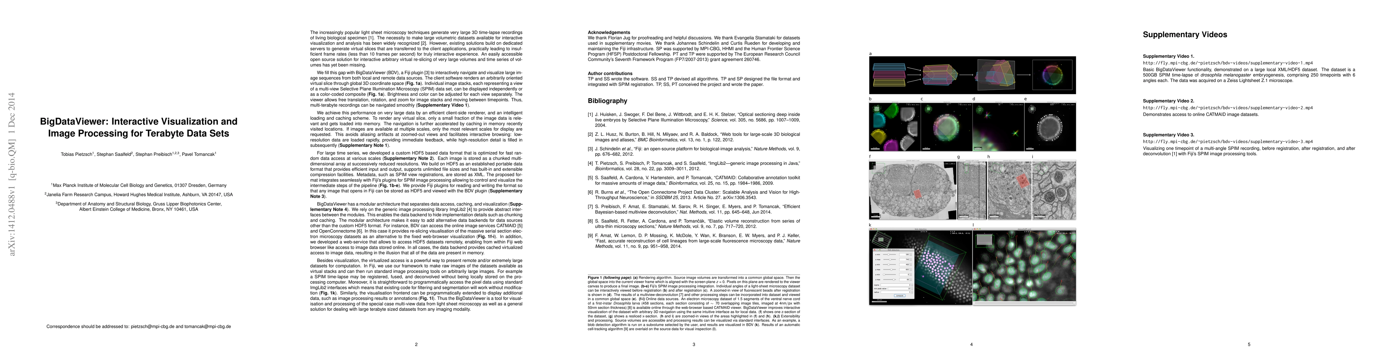 BigDataViewer is an open-source Fiji plugin designed for interactive visualization of large 3D time-lapse microscopy datasets, addressing the need for fast, high-frame-rate navigation through terabyte-scale data. It enables arbitrary virtual re-slicing of volumes and time series from local and remote sources.