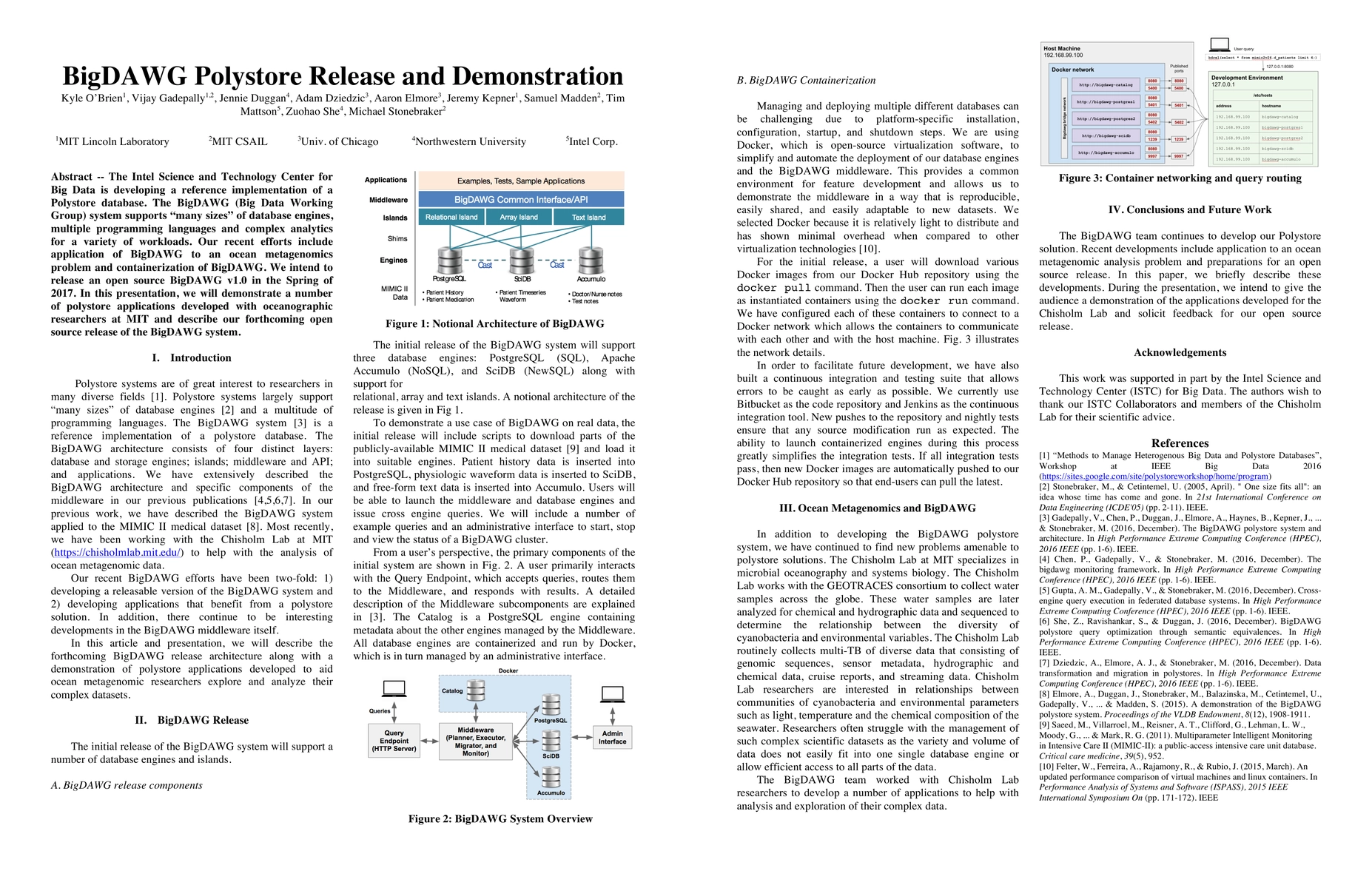 The BigDAWG Polystore system, developed by the Intel Science and Technology Center, integrates multiple database engines and programming languages for diverse analytics workloads. The team plans to release an open-source version in Spring 2017, showcasing its application in ocean metagenomics and its containerization.