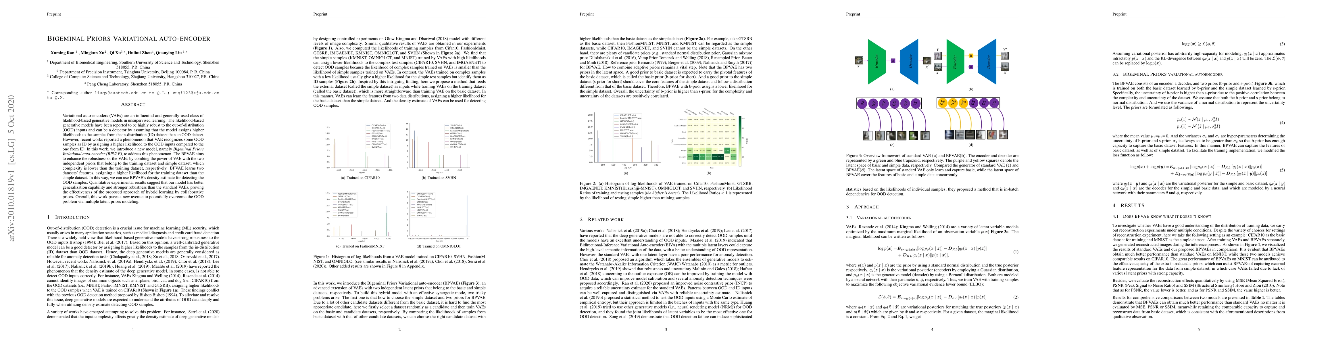 The paper introduces the Bigeminal Priors Variational auto-encoder (BPVAE) to enhance the robustness of VAEs against out-of-distribution inputs by employing two independent priors—one from the training dataset and another from a simpler dataset. Experimental results show that BPVAE has better generalization and robustness compared to standard VAEs.