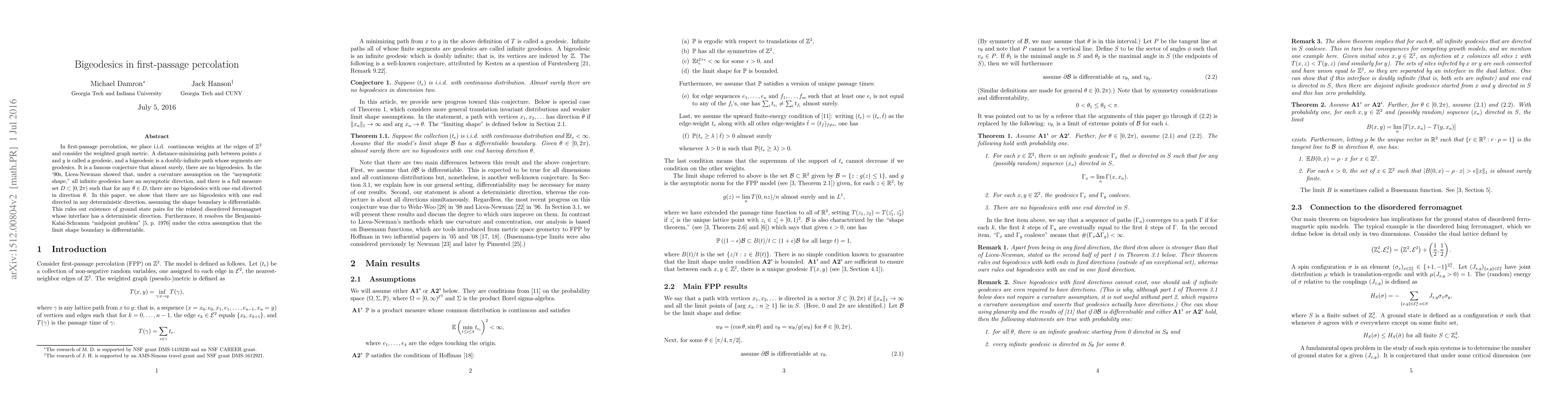 In first-passage percolation, we place i.i.d. continuous weights at the edges of Z^2 and consider the weighted graph metric. A distance-minimizing path between points x and y is called a geodesic, and a bigeodesic is a doubly-infinite path whose segments are geodesics. It is a famous conjecture that almost surely, there are no bigeodesics. In the '90s, Licea-Newman showed that, under a curvature assumption on the "asymptotic shape", all infinite geodesics have an asymptotic direction, and there is a full-measure set D of [0, 2 pi) such that for any theta in D, there are no bigeodesics with one end directed in direction theta. In this paper, we show that there are no bigeodesics with one end directed in any deterministic direction, assuming the shape boundary is differentiable. This rules out existence of ground state pairs for the related disordered ferromagnet whose interface has a deterministic direction. Furthermore, it resolves the Benjamini-Kalai-Schramm "midpoint problem" under the extra assumption that the limit shape boundary is differentiable.