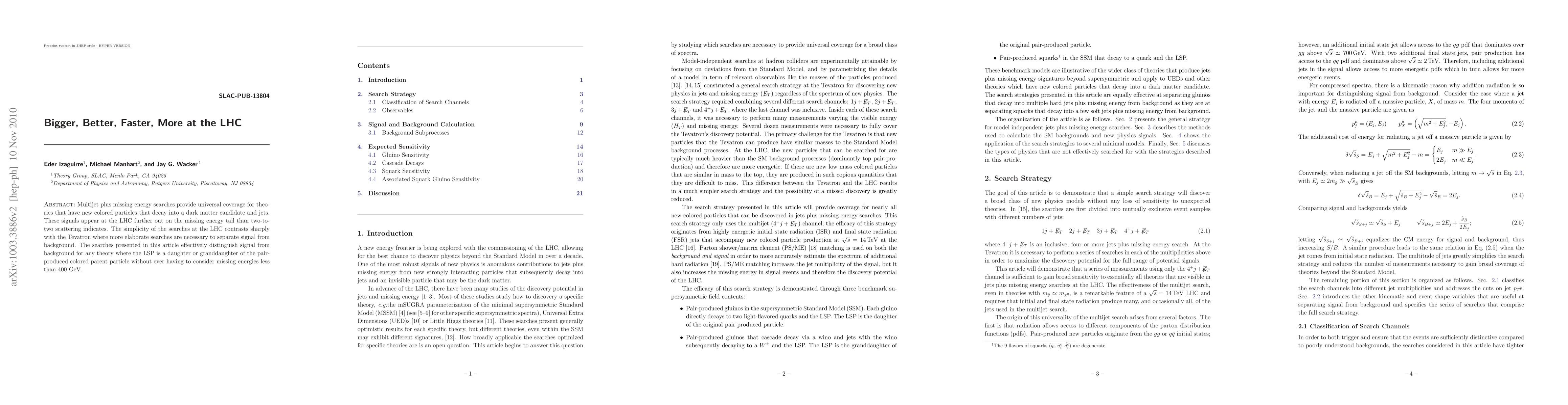Multijet plus missing energy searches provide universal coverage for theories that have new colored particles that decay into a dark matter candidate and jets. These signals appear at the LHC further out on the missing energy tail than two-to-two scattering indicates. The simplicity of the searches at the LHC contrasts sharply with the Tevatron where more elaborate searches are necessary to separate signal from background. The searches presented in this article effectively distinguish signal from background for any theory where the LSP is a daughter or granddaughter of the pair-produced colored parent particle without ever having to consider missing energies less than 400 GeV.