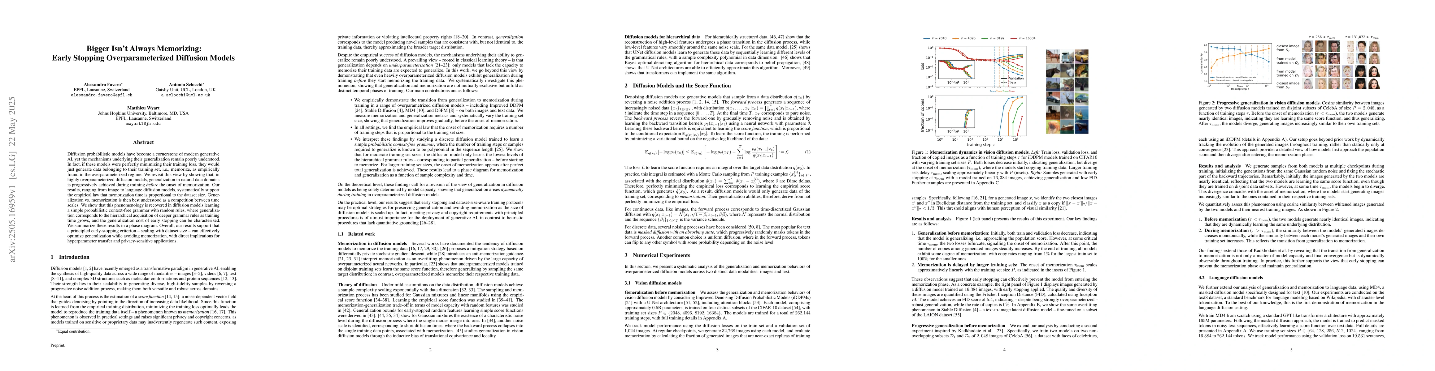 The paper presents a phase diagram summarizing the generalization vs. memorization competition in diffusion models and proposes a principled early-stopping criterion based on dataset size.