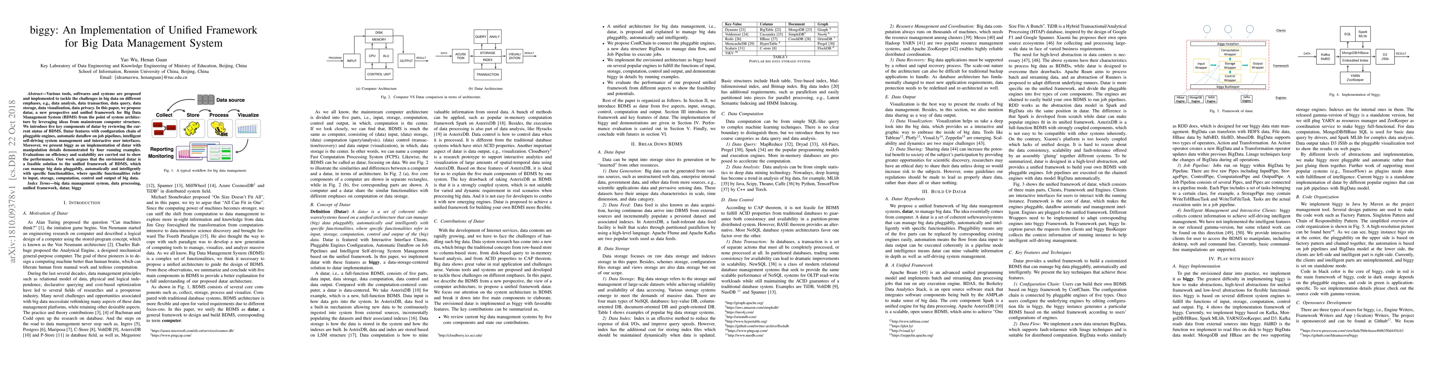 This paper introduces "biggy," an implementation of the "datar" unified framework for Big Data Management Systems (BDMS), featuring pluggable engines, automatic dataflow, intelligent management, and interactive interfaces. Evaluations demonstrate its efficiency and scalability, arguing for its feasibility as a comprehensive solution for managing big data.