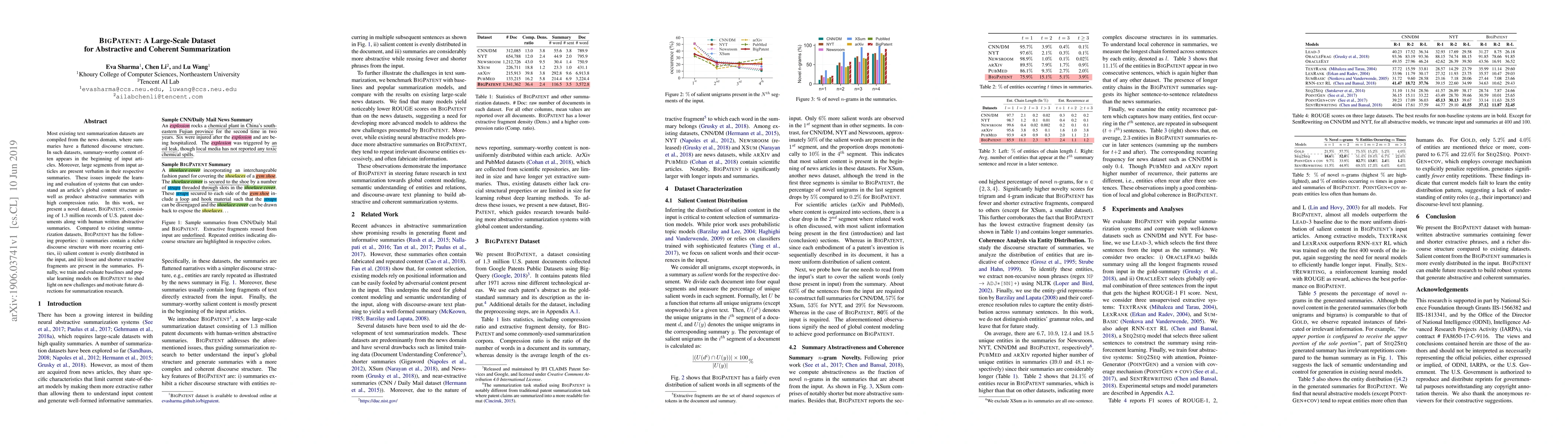 BIGPATENT is a new dataset comprising 1.3 million U.S. patent documents and their human-written abstractive summaries, designed to better evaluate systems that can produce highly compressed summaries with a richer discourse structure. It aims to address limitations of existing summarization datasets by evenly distributing salient content and minimizing verbatim excerpts.